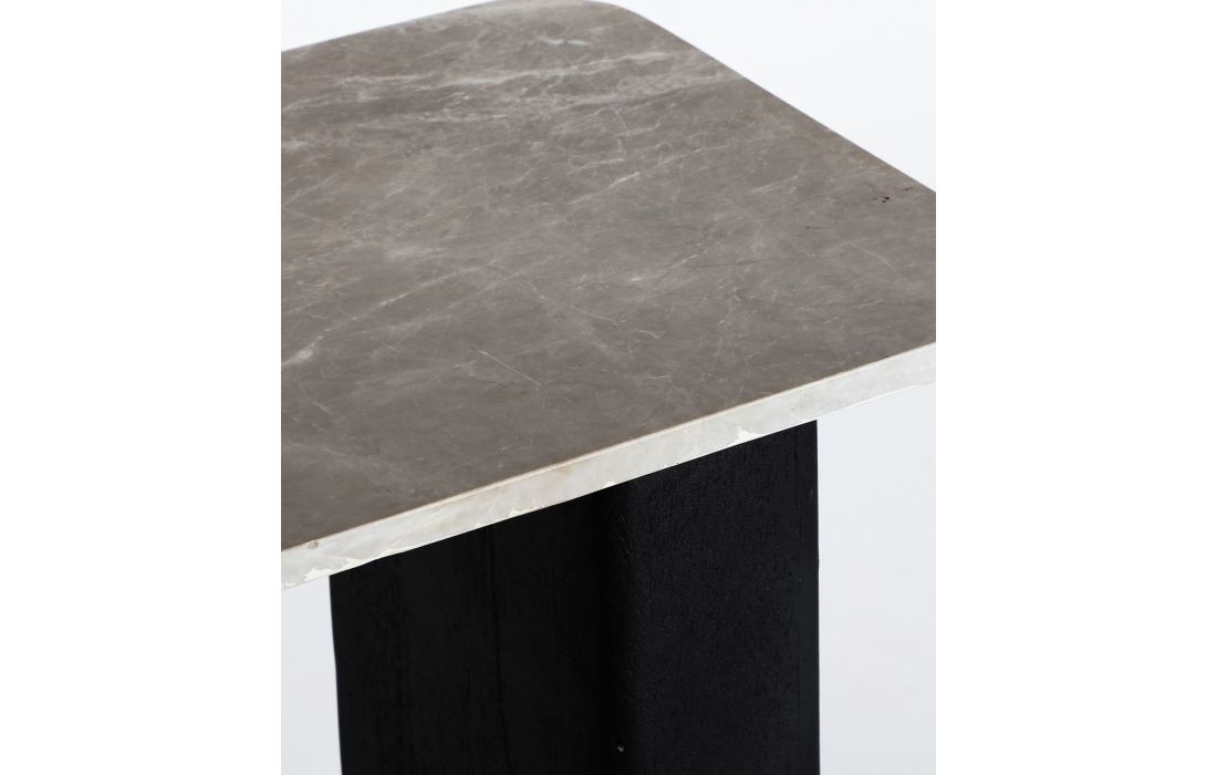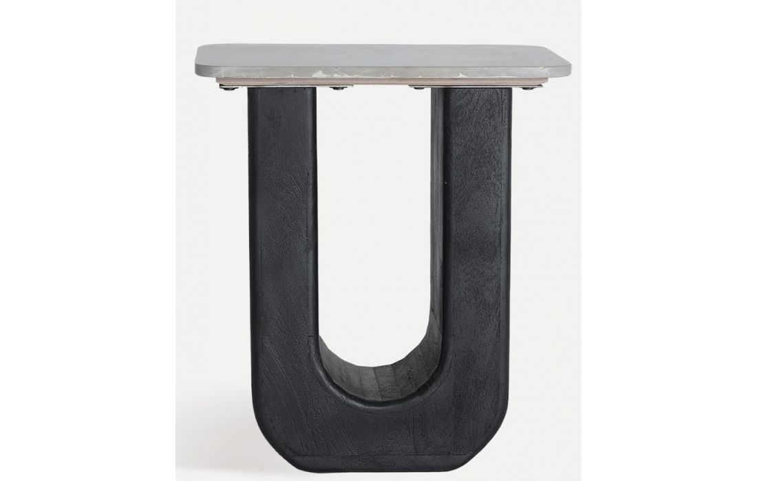 A MESA DE APOIO KHEJ, mescla design contemporâneo e materiais naturais. Sua base em U em madeira de mango é combinada com um envelope de mármore que fornece sofisticação.