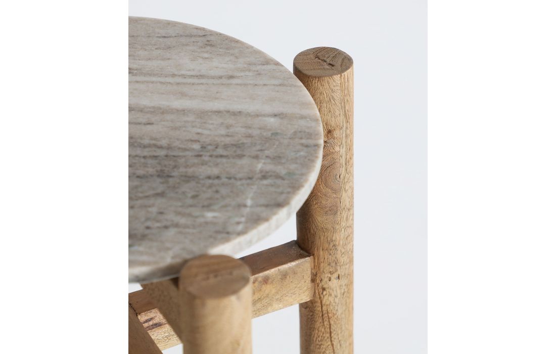 A MESA DE APOIO LACUANE combina mármore e madeira de mango em uma fusão de textura e equilíbrio. Seu design simples, mas sofisticado, o torna um complemento ideal ao lado do sofá, da cama ou de um canto de leitura.