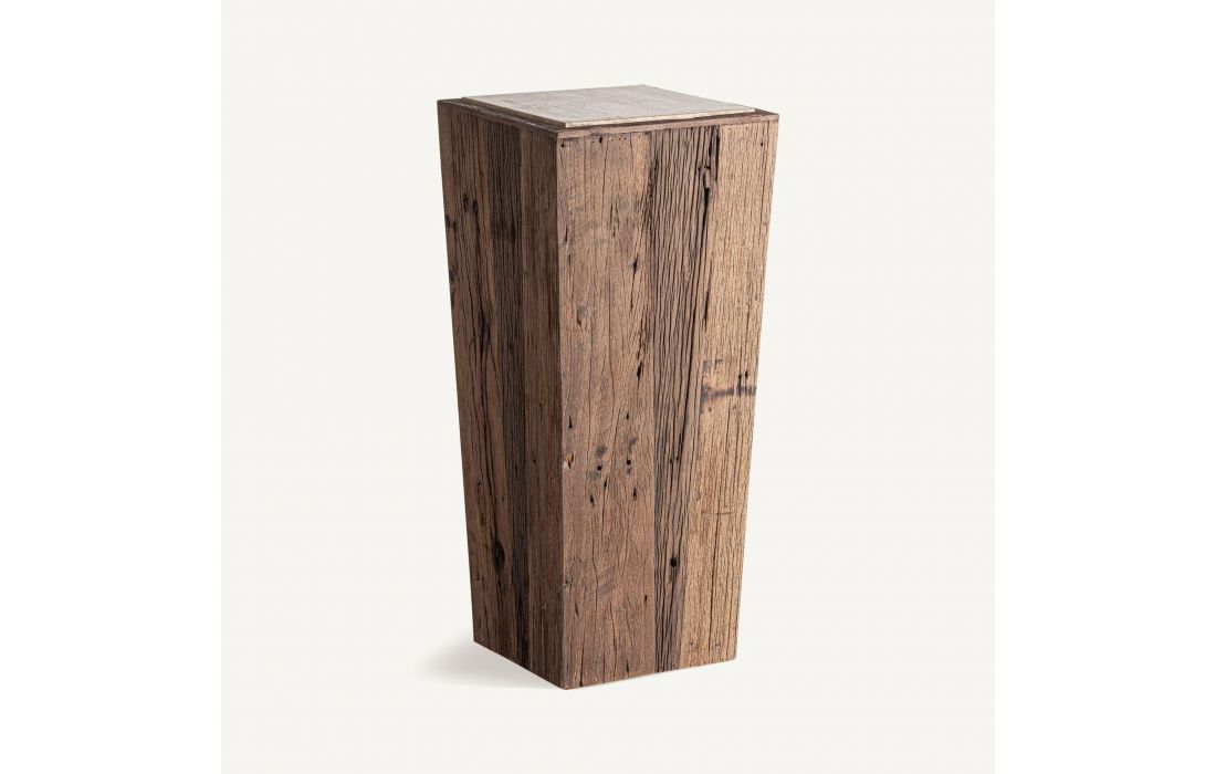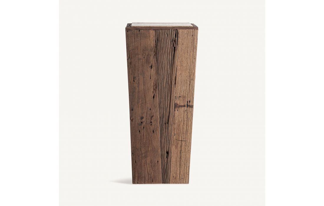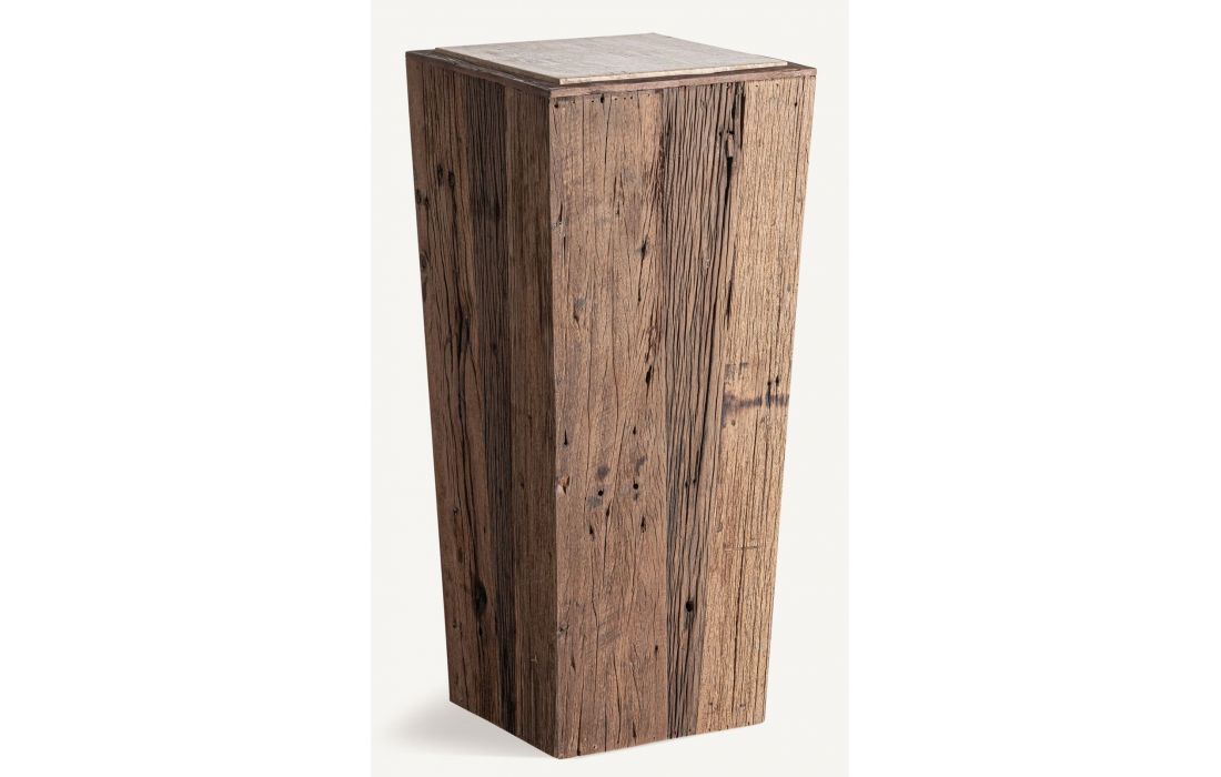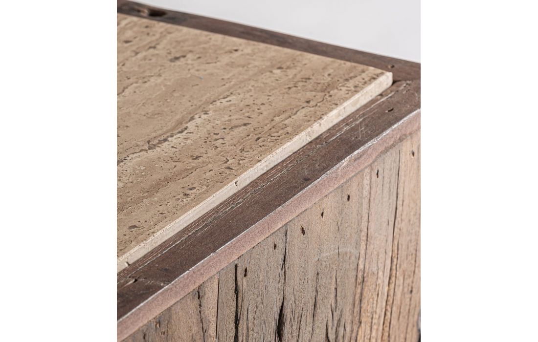 Esta mesa de apoio feita de madeira recuperada com acabamento envelhecido e base de travertino, é perfeita para destacar objetos decorativos, esculturas ou peças únicas.Destinatário :