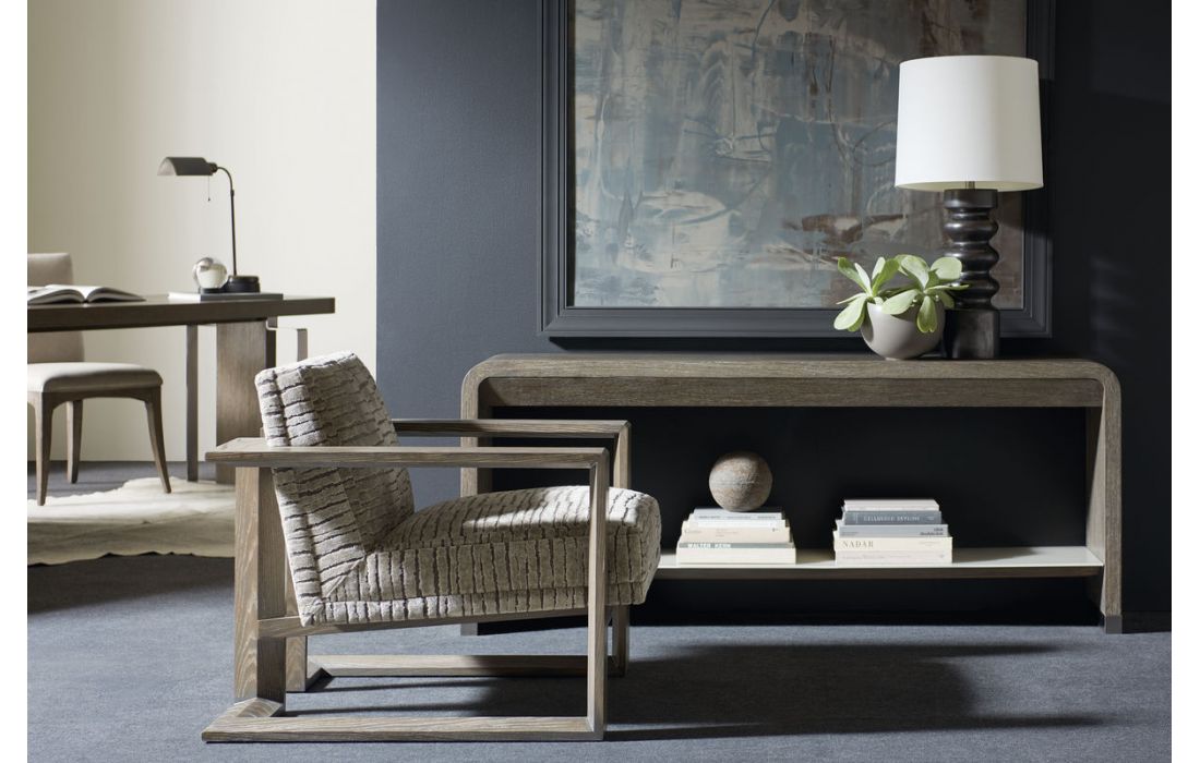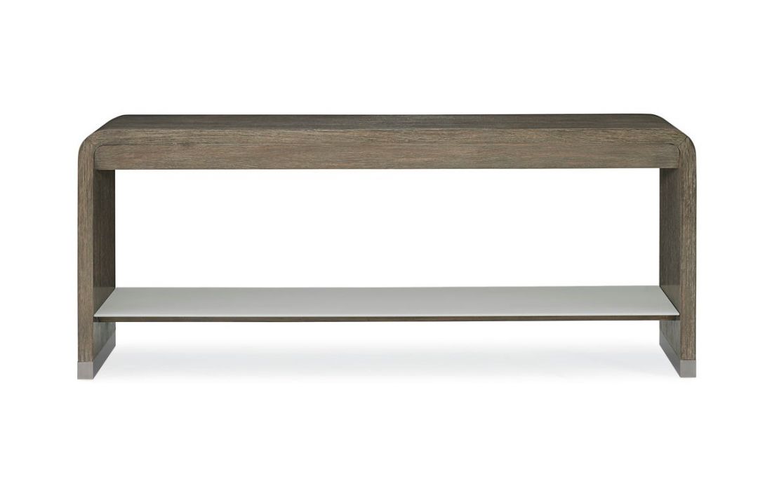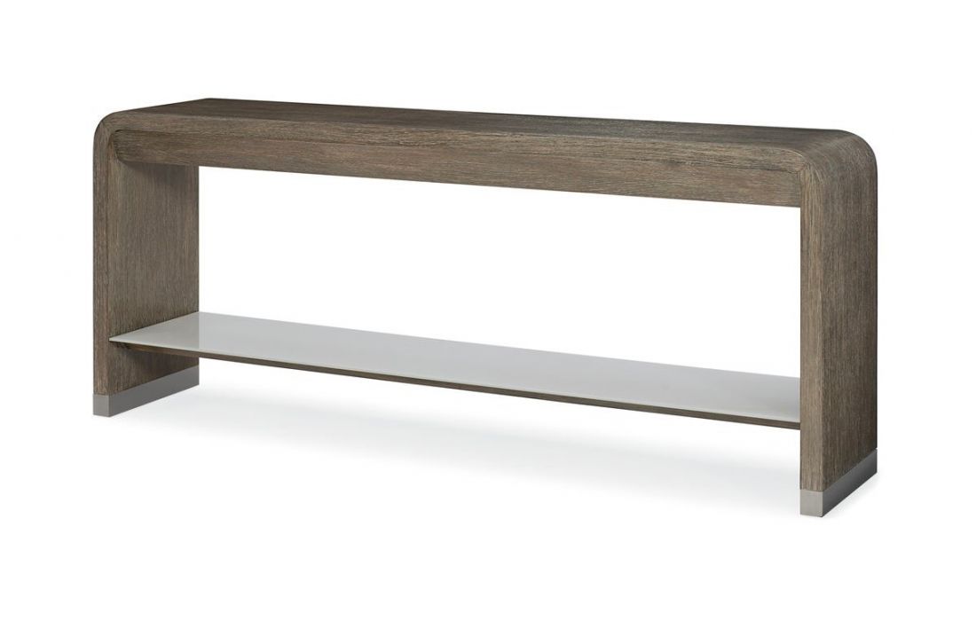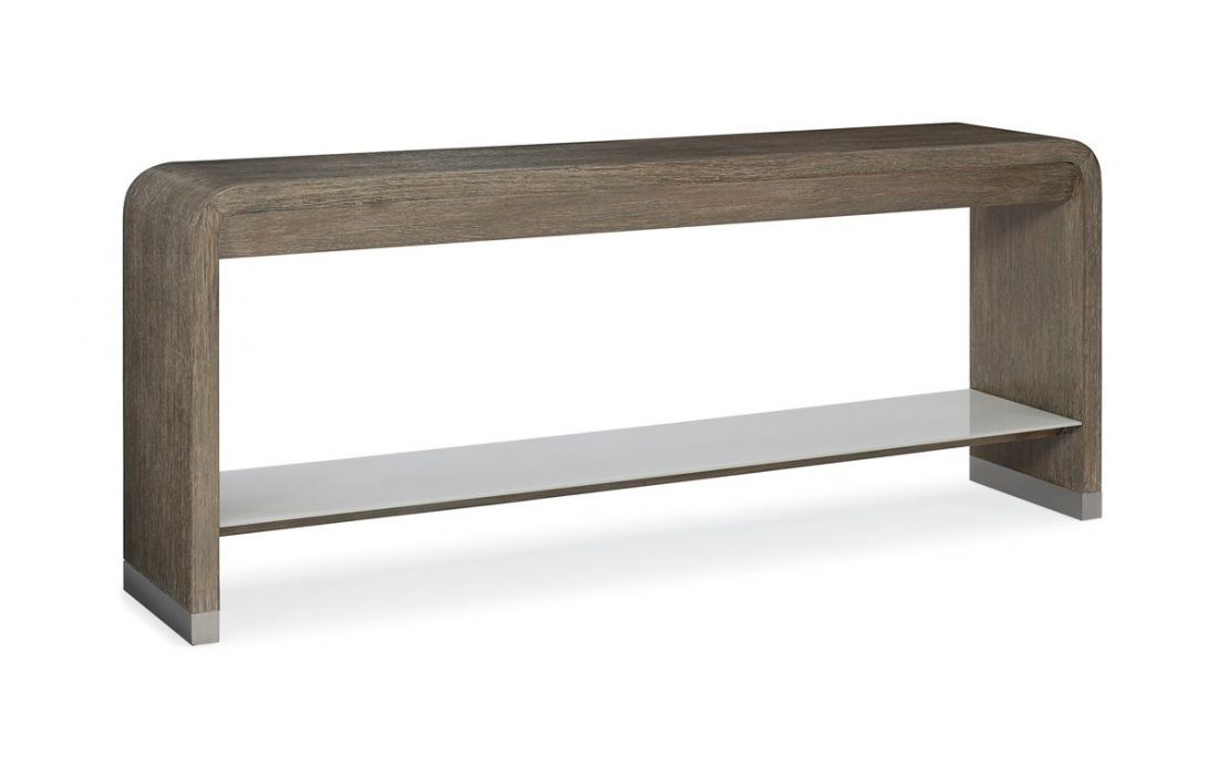 Consola em carvalho com prateleira de vidro cinza "Delicate Grey" e pormenores nos pés em aço inoxidável fumado.