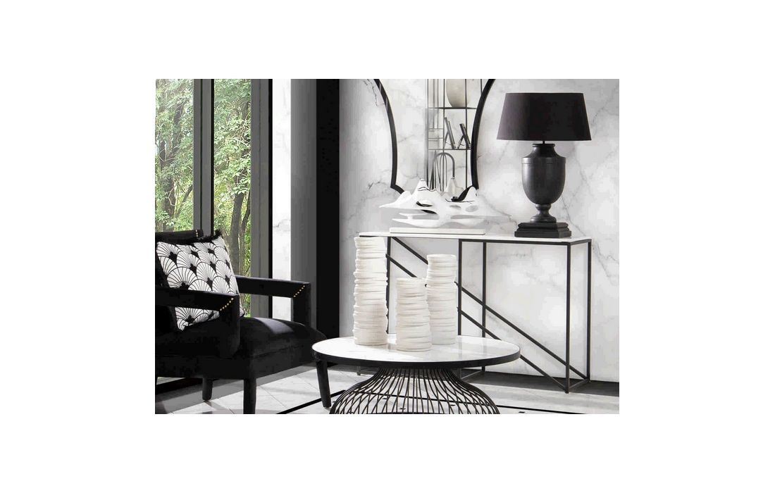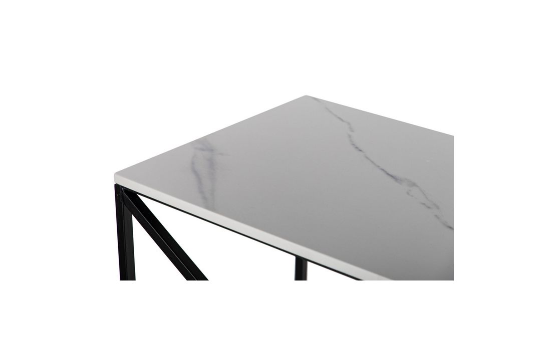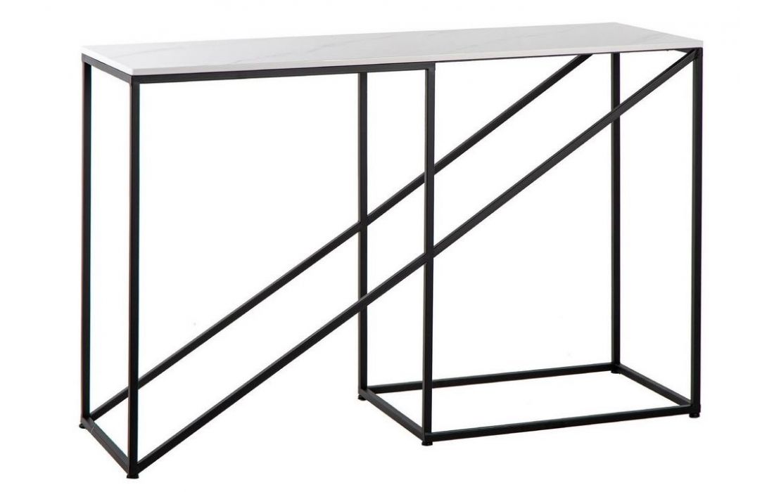 Consola com tampo em mármore falso na cor branca e pés em metal na cor preta