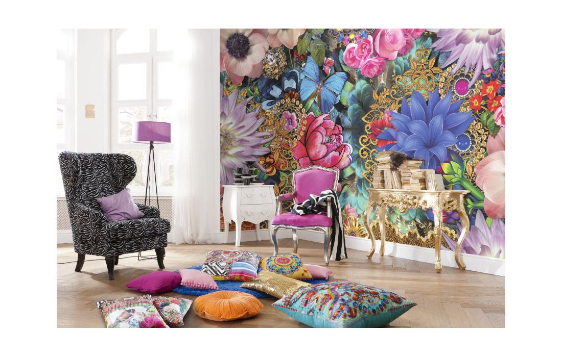 Papel de parede com padrões florais, estampas de animais e ornamentação dourada adicionam um toque de luxo a este extravagante olho-catcher.