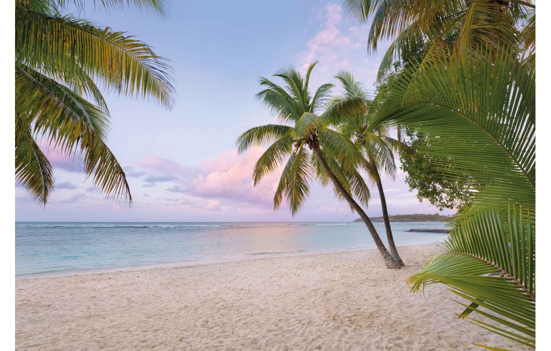 Tingido em rosa delicado, o céu sobre a ilha das Caraíbas de Guadalupe anuncia o início de um novo dia ensolarado.