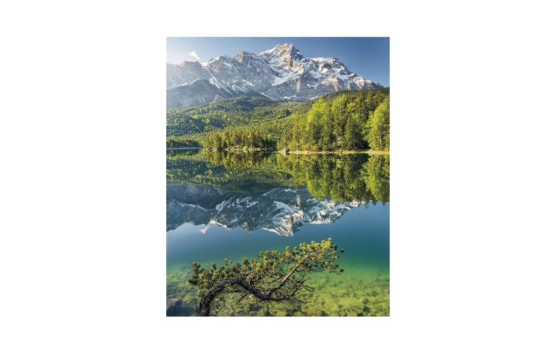A montanha "Zugspitze" sobe 2962 metros acima do cristalino lago Eibsee no sul da Baviera.