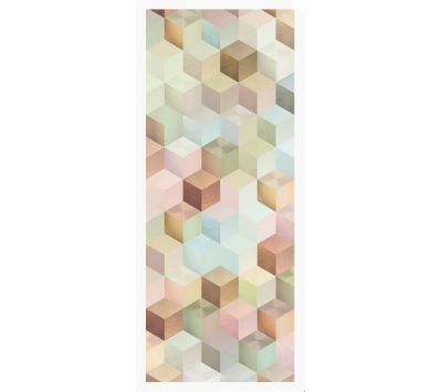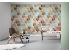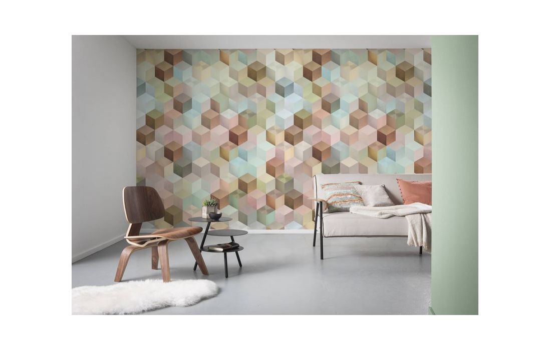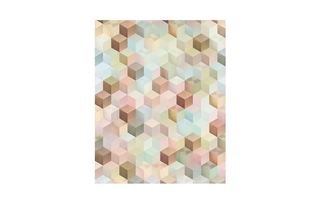 Estruturas metálicas brilhantes em cubos 3D pastel.
