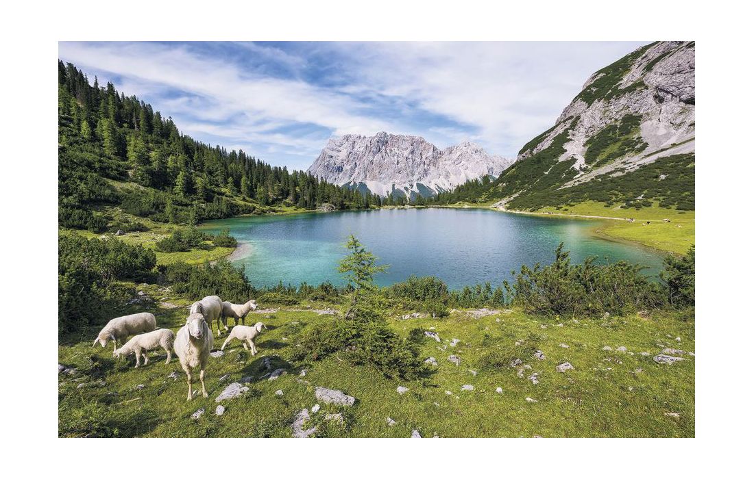 Idyll puro da montanha nas costas do lago Seebensee nos alpes austríacos.