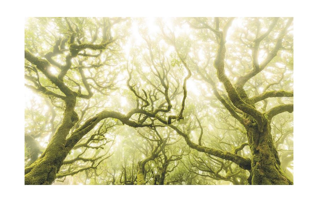 Coloque sua cabeça no pescoço para descobrir um céu azul através dos ramos retorcidos das árvores de louro.