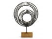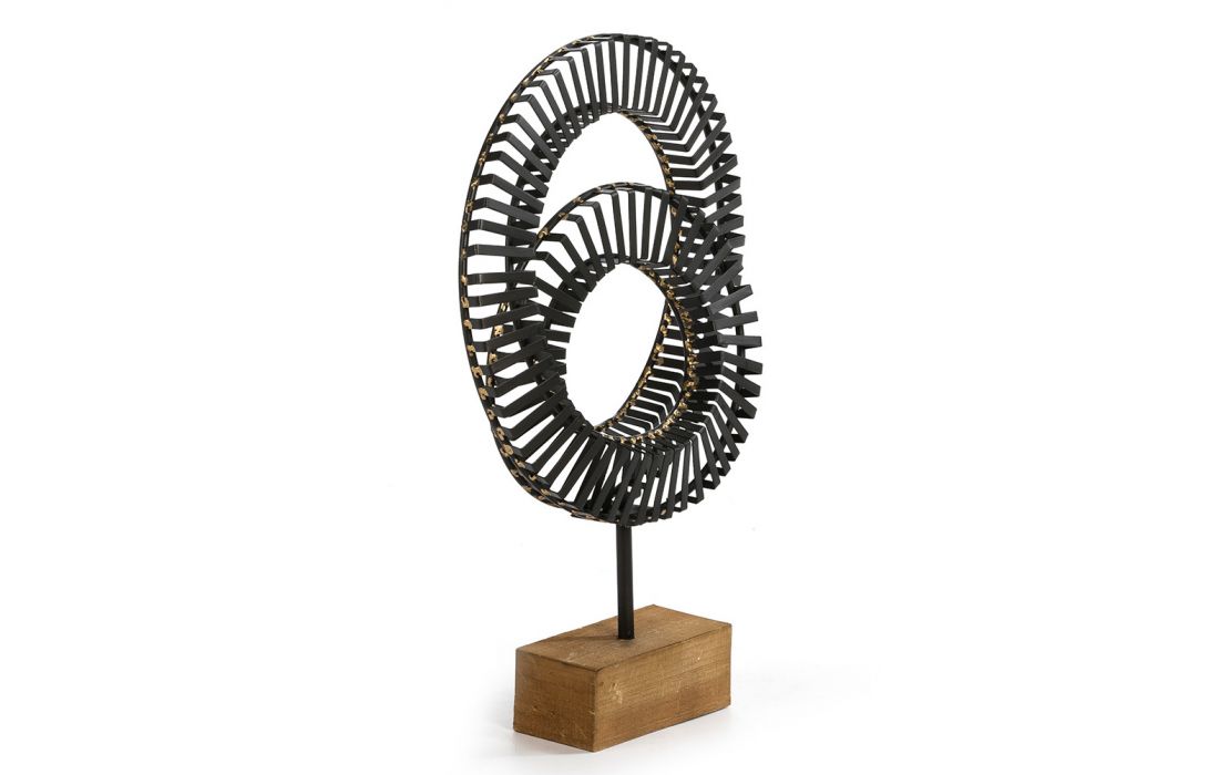 Peça decorativa com estrutura de metal preto/dourado e base em madeira natural.