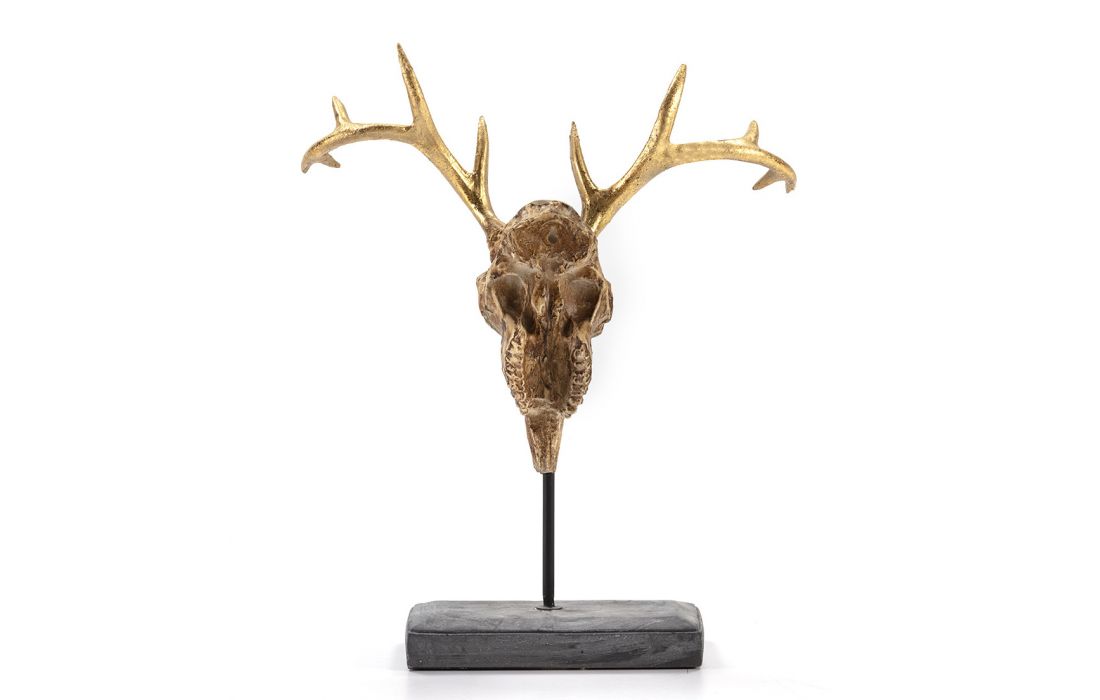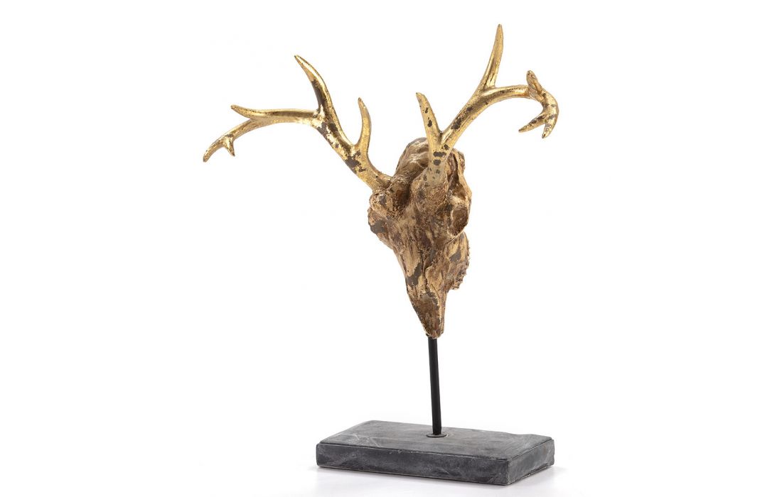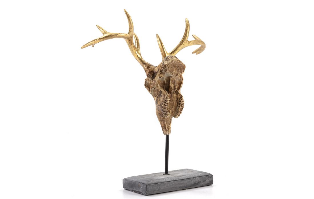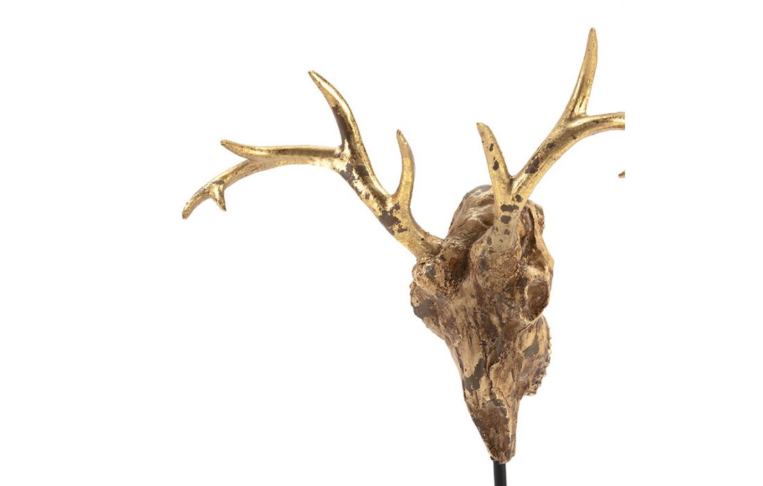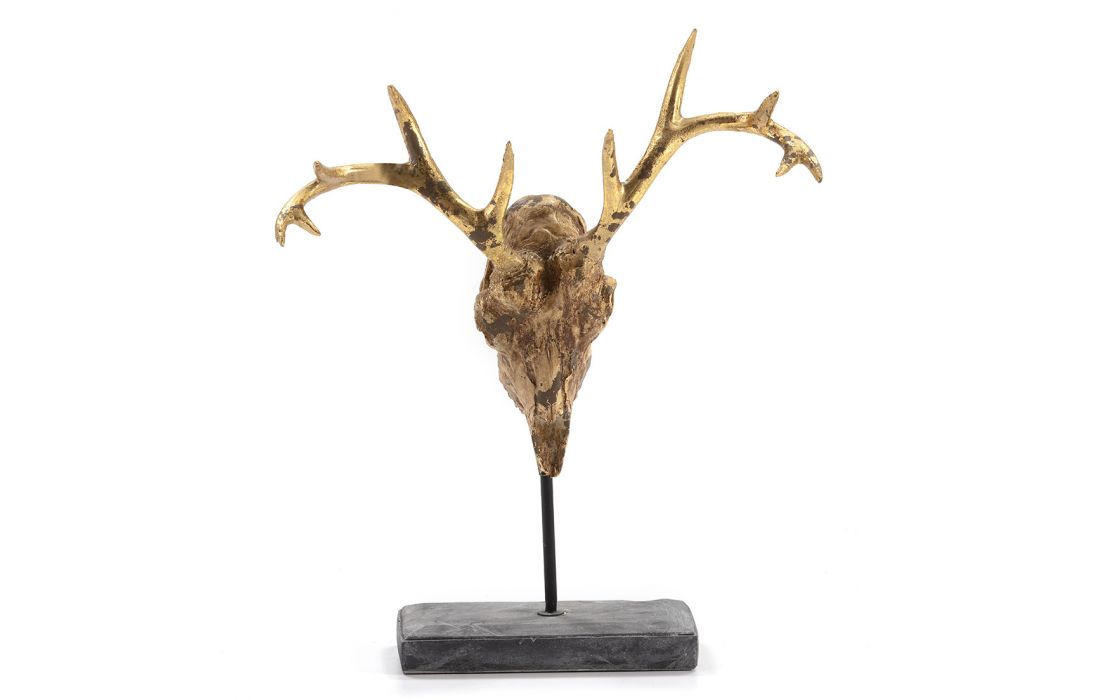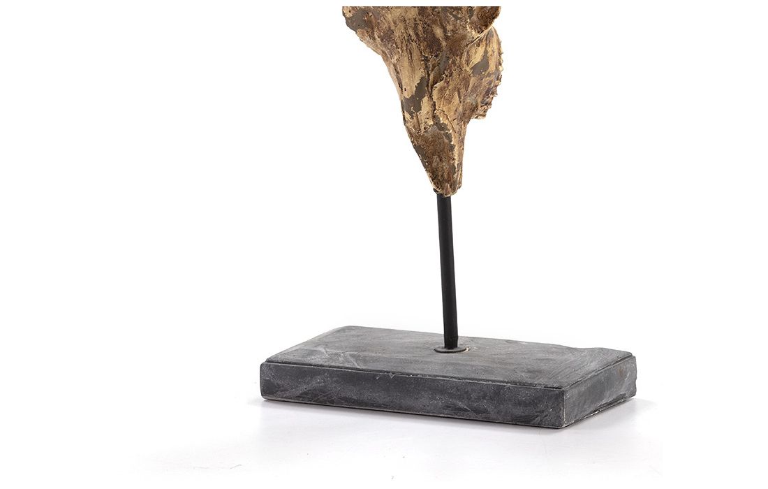 Peça decorativa em resina cinza/dourado e base de metal preto.