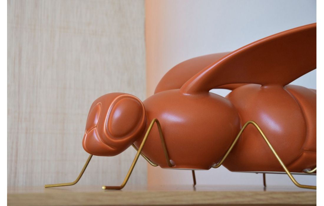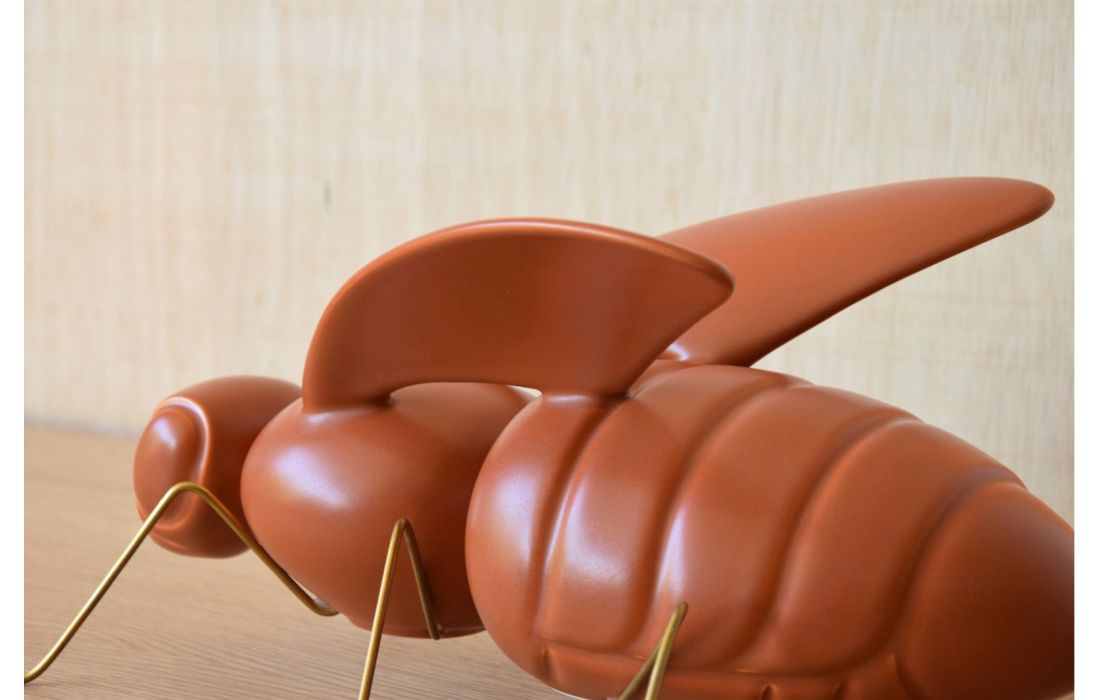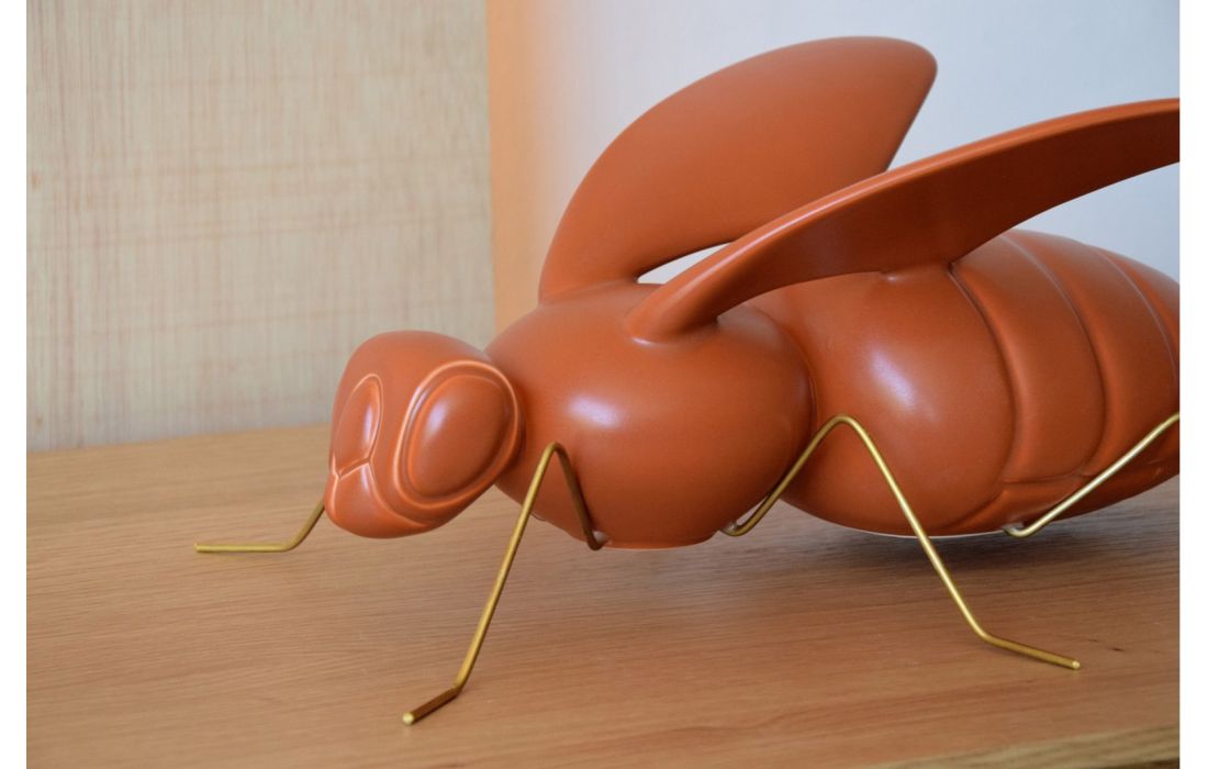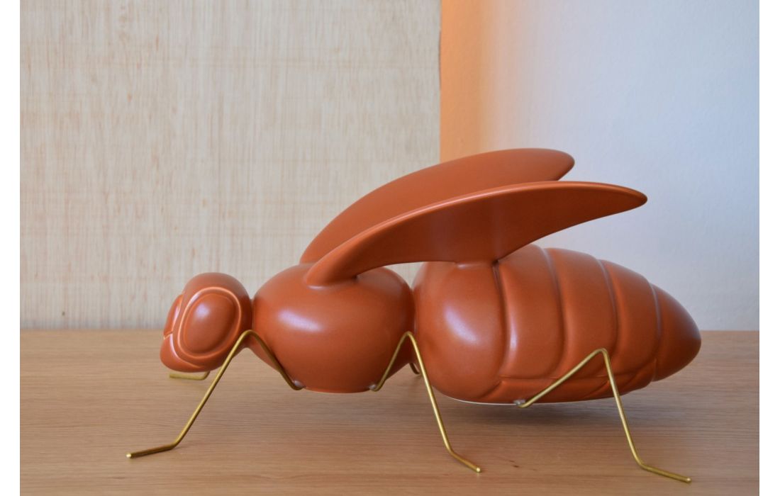 Peça decorativa em figura de abelha feita em cerâmica cor telha e pés em metal dourado envelhecido.