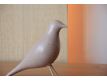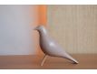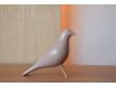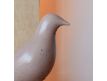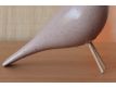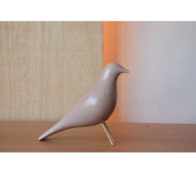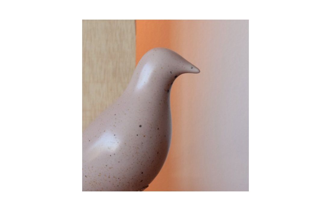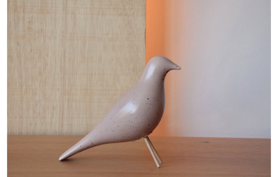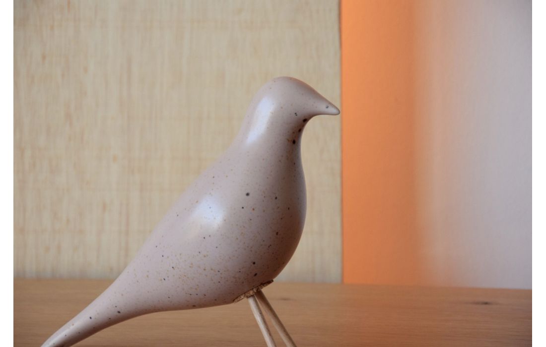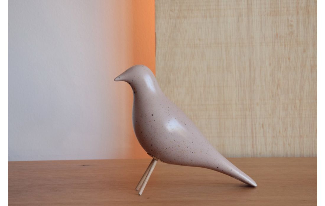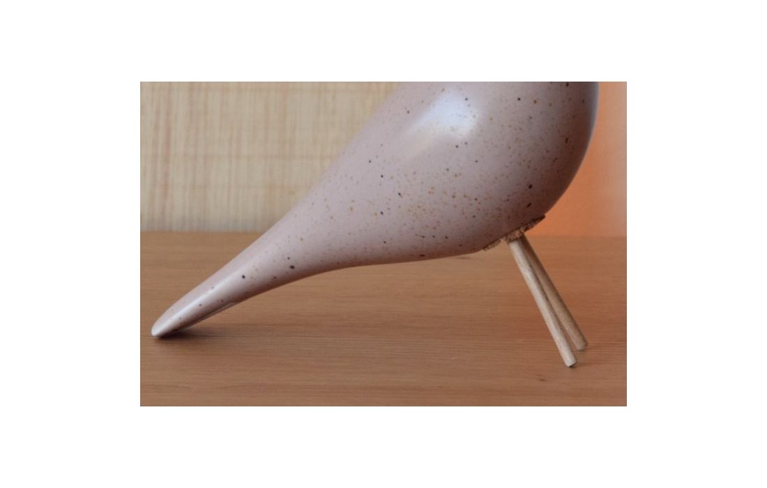 Peça decorativa em figura de pássaro feita em cerâmica com acabamento rosa com pintas mate e pernas em madeira.