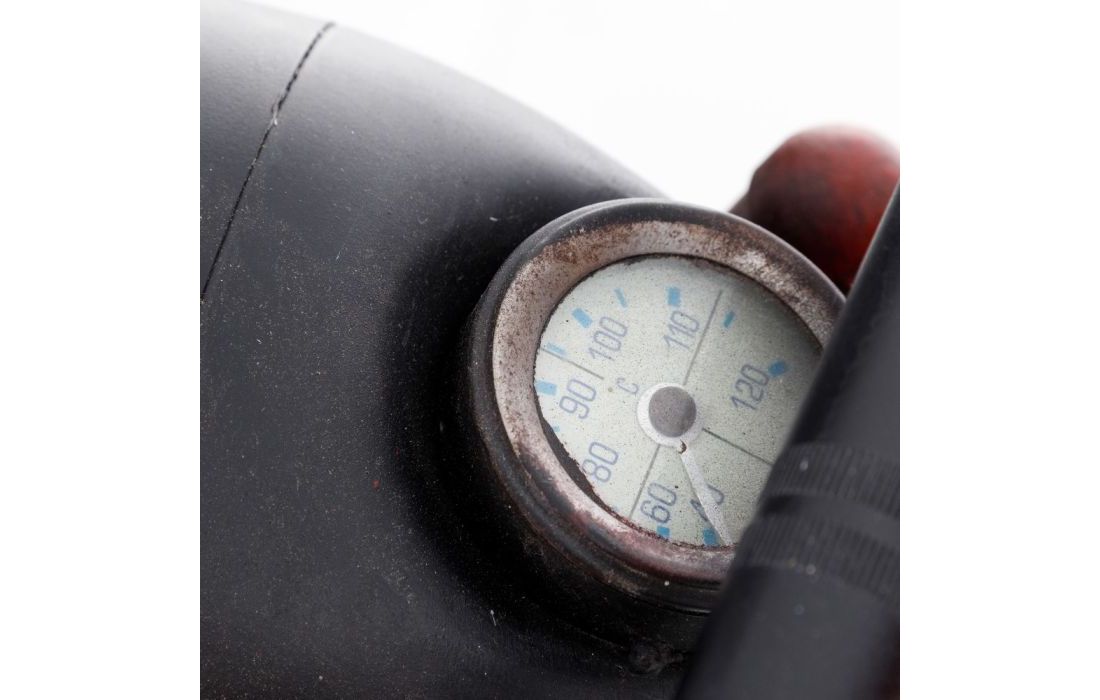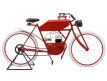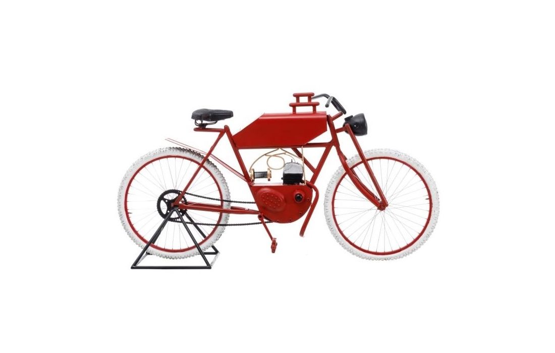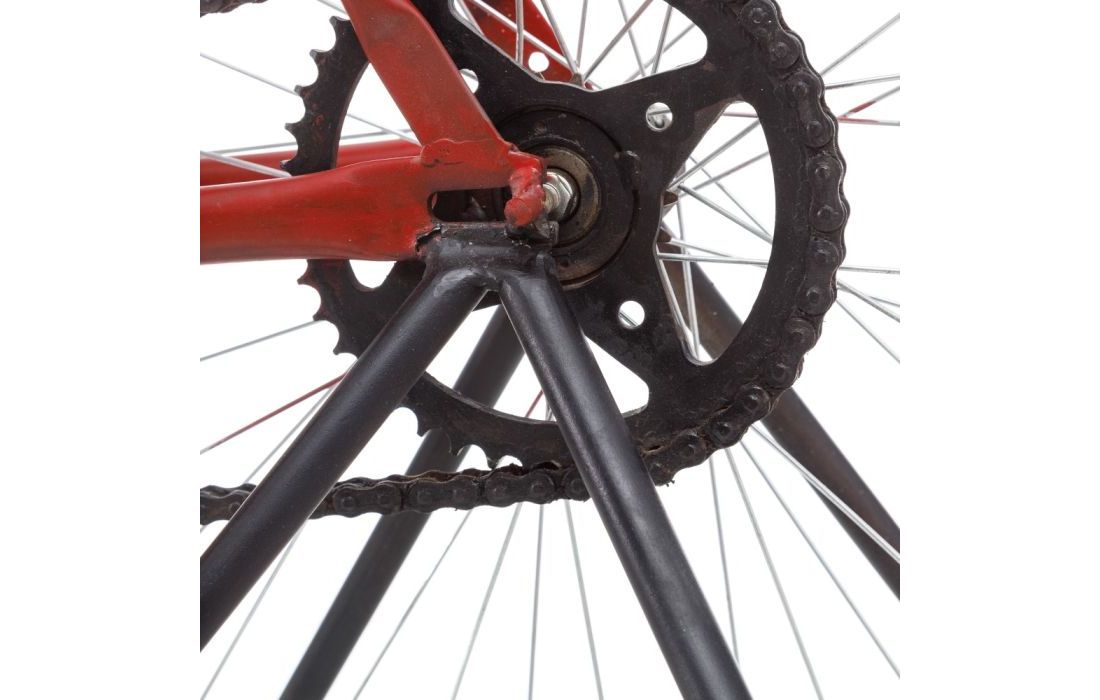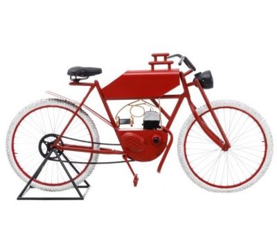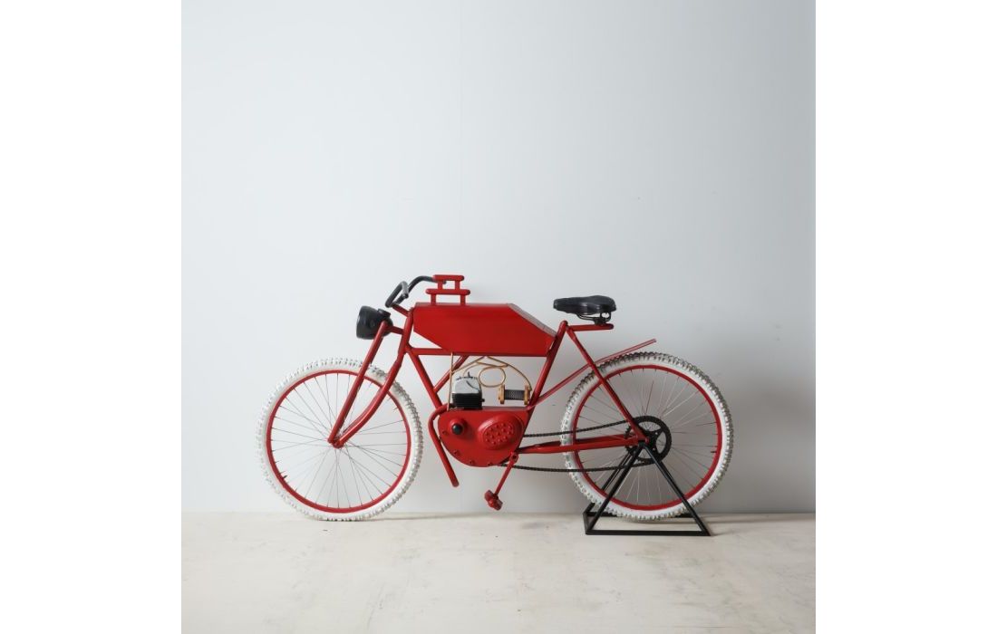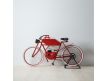 Peça decorativa em forma de bicicleta feita em ferro na cor vermelho com descansso.