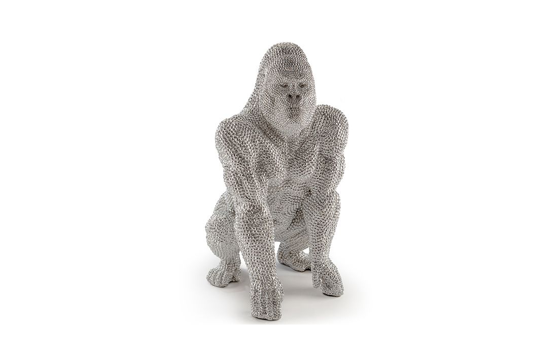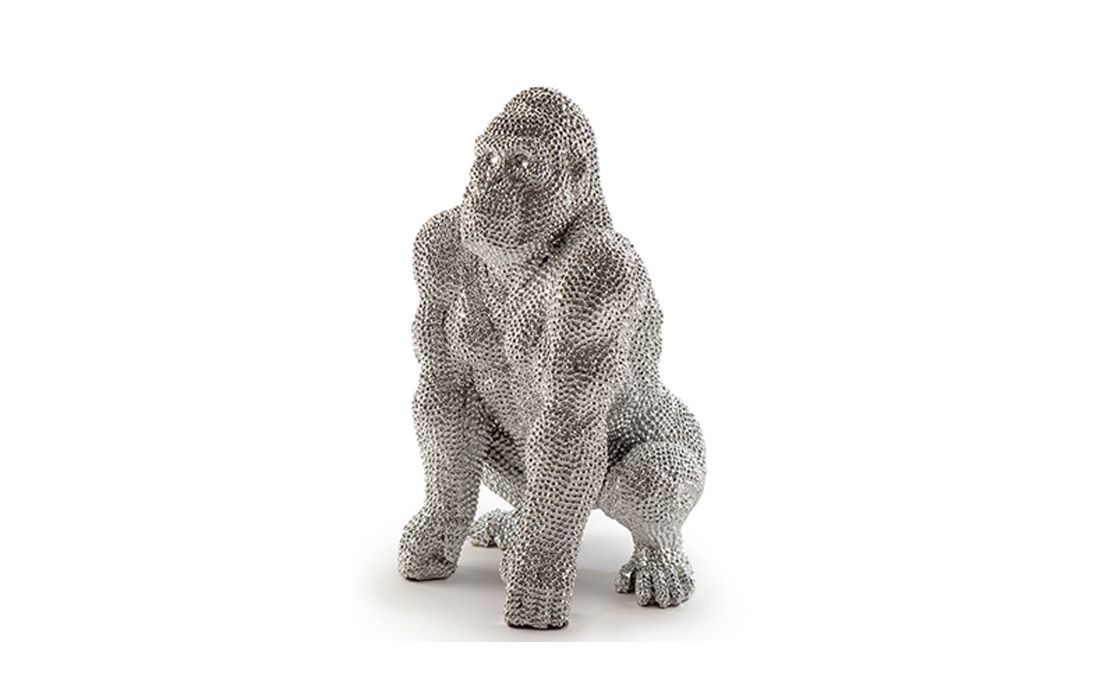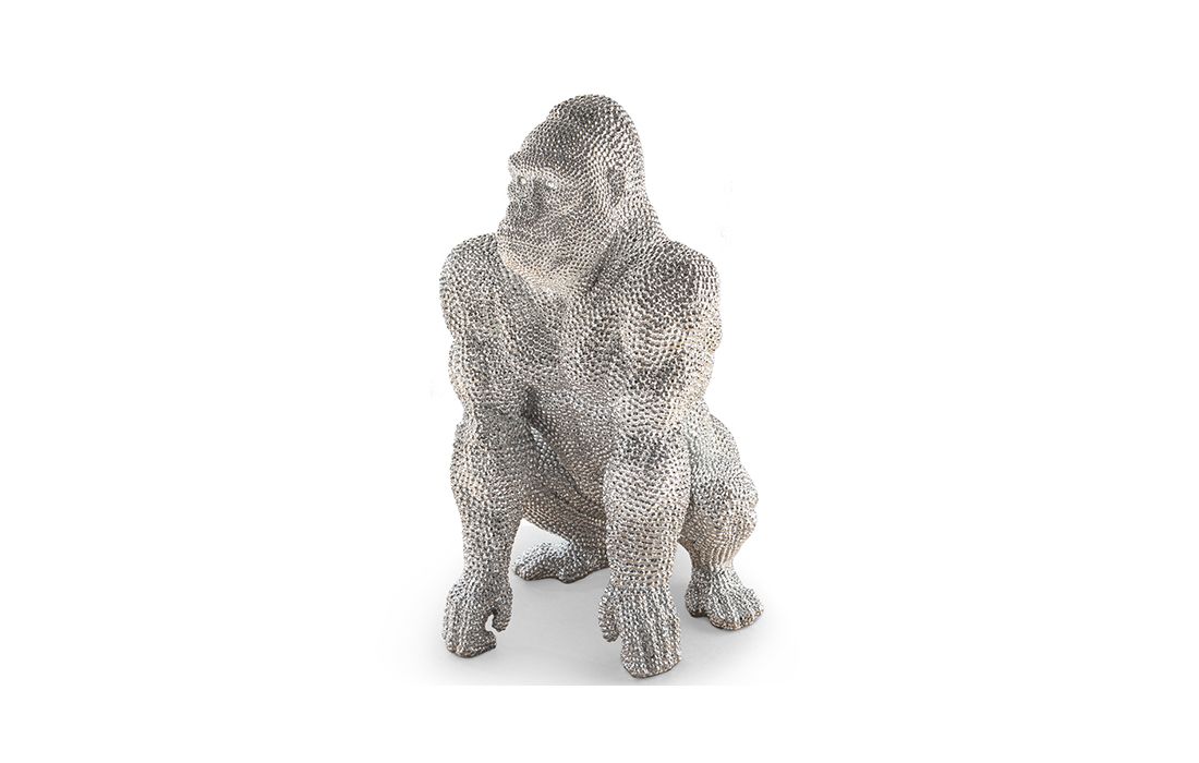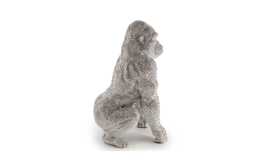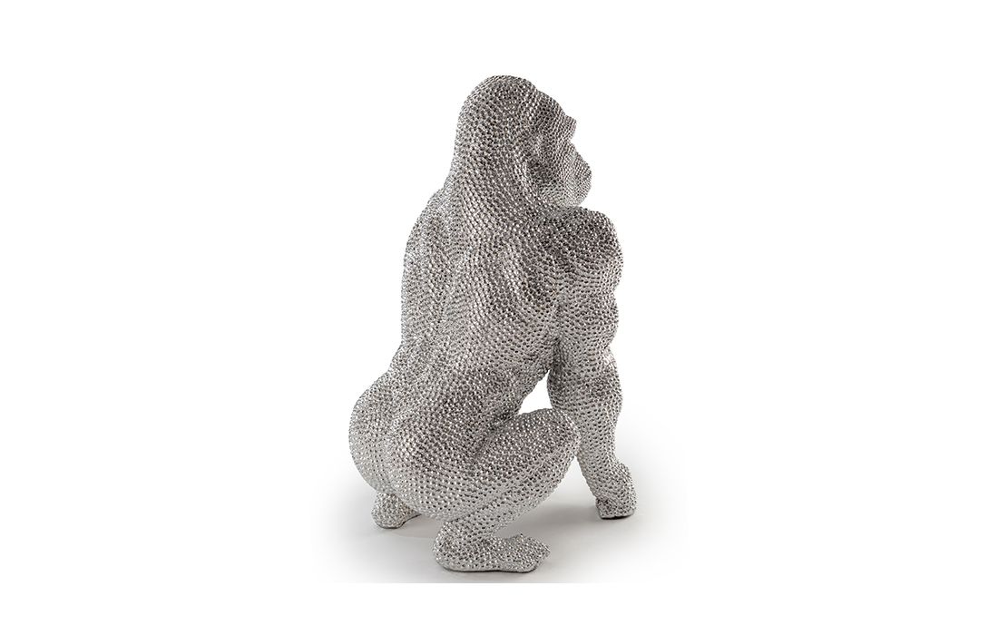 Figura de gorila, realizada em poliresina. Acabamento prateado com textura imitação de incrustações de pedras. Disponivel em tamanho grande e pequeno.