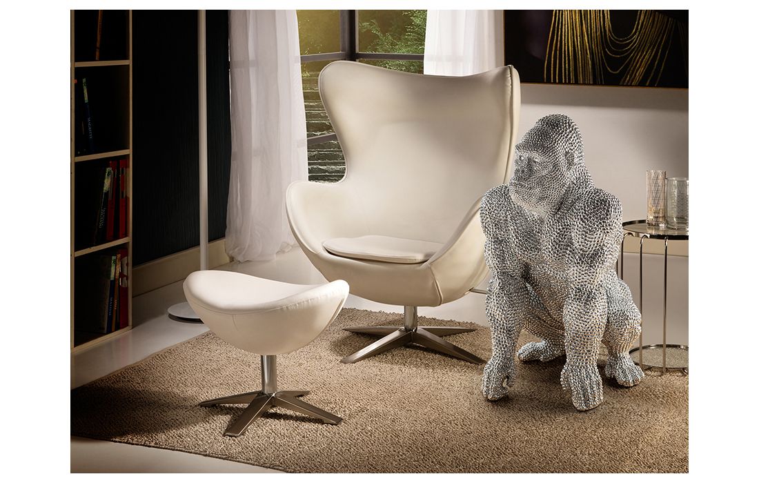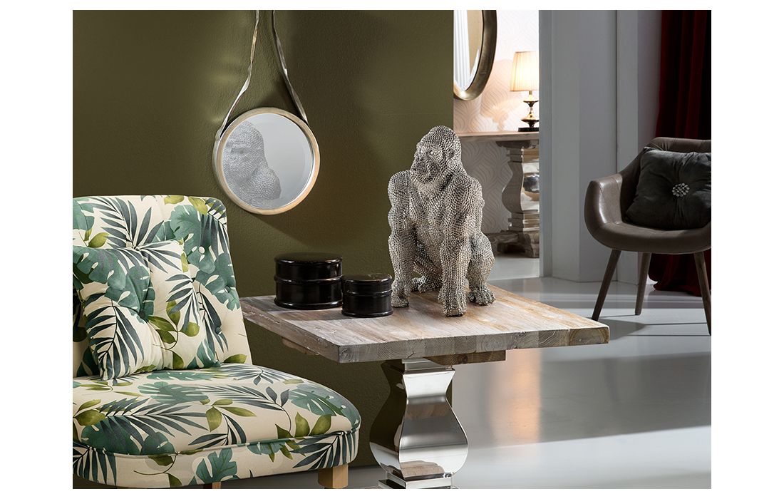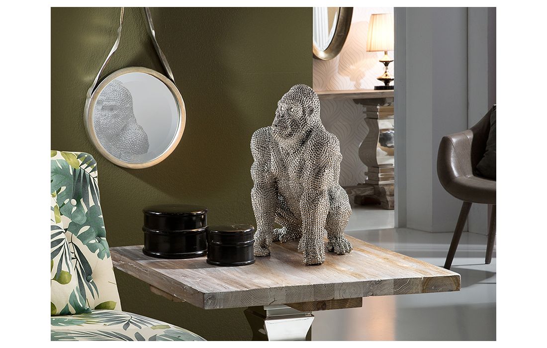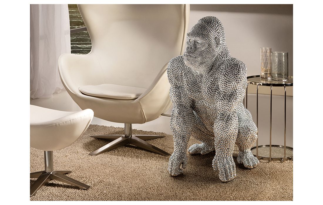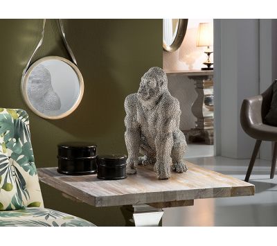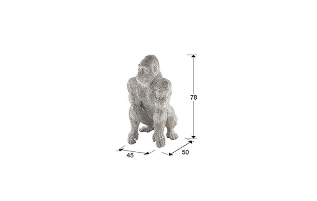 Figura de gorila, realizada em poliresina. Acabamento prateado com textura imitação de incrustações de pedras. Disponivel em tamanho grande e pequeno.