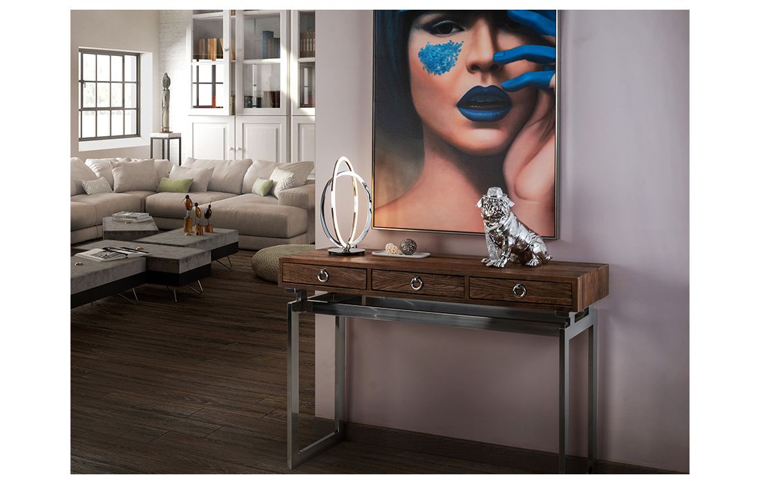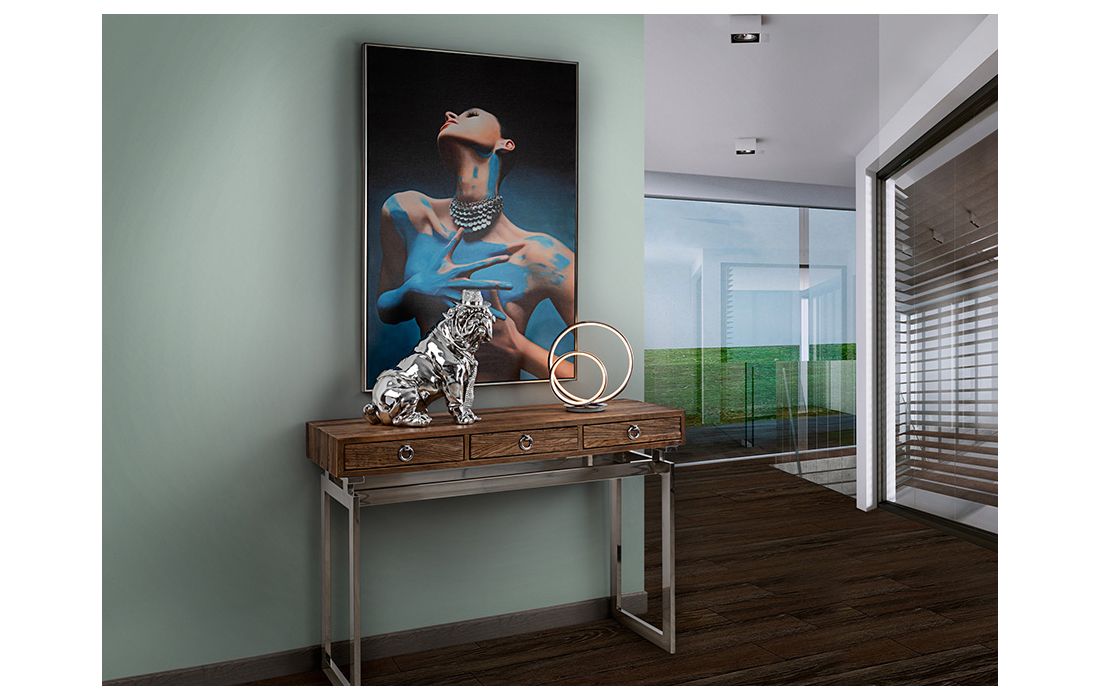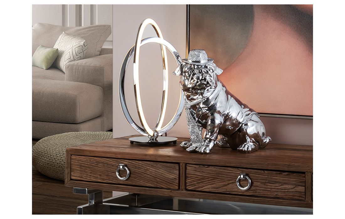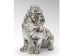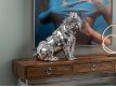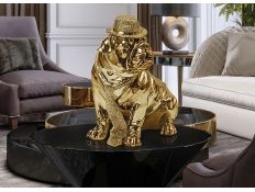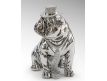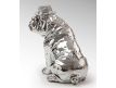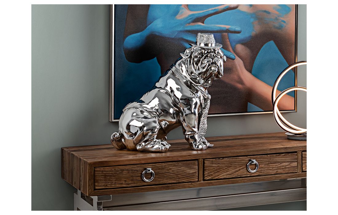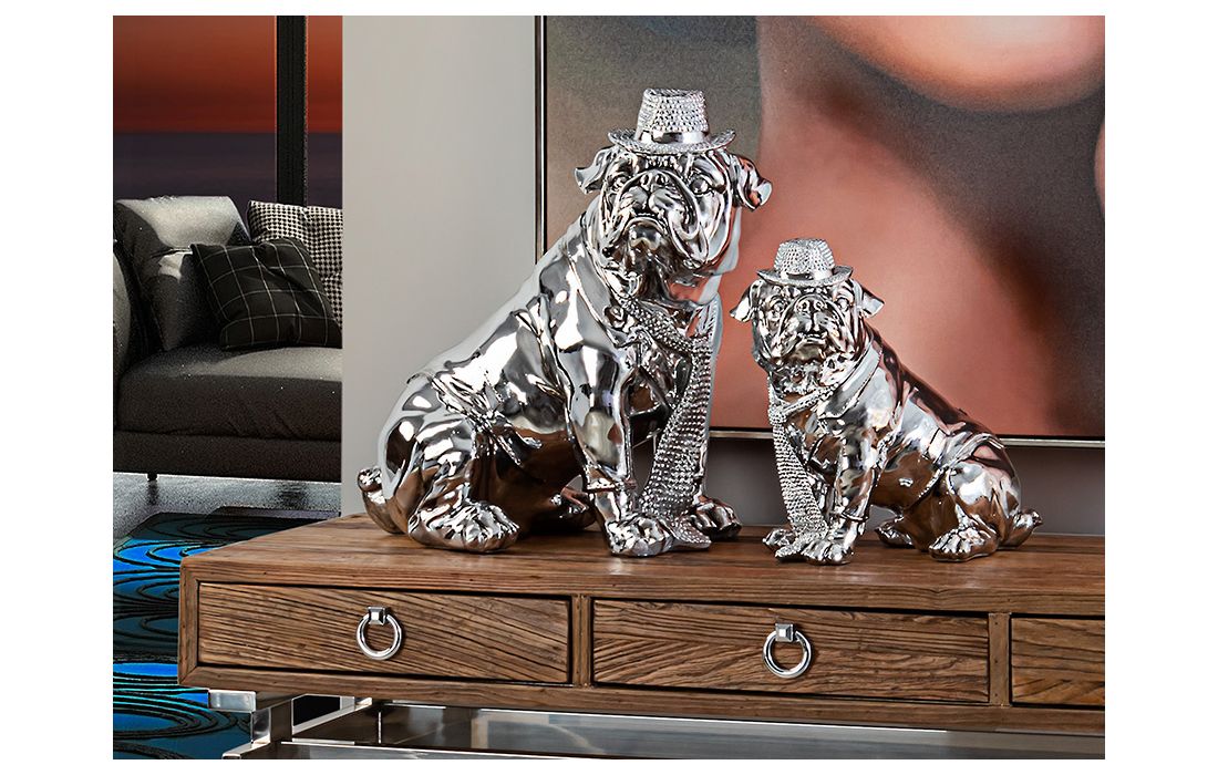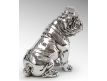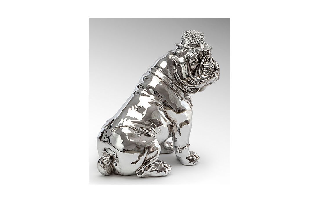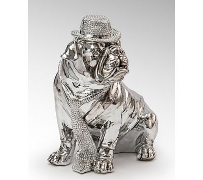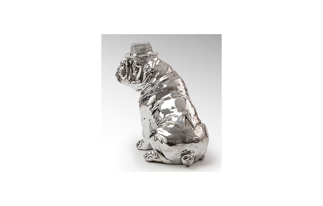 Figura de cão com chapéu e gravata, raça bull dog. Realizada em polirresina, acabamento em banho eletrolítico cromado. Disponivel em tamanho medio e pequeno.