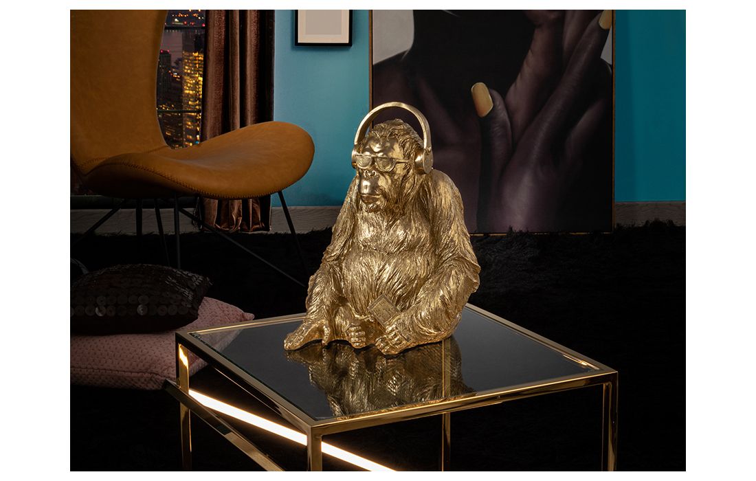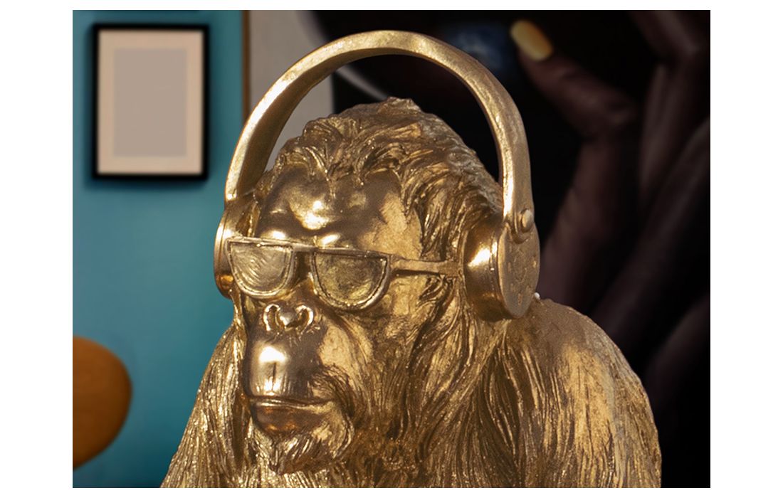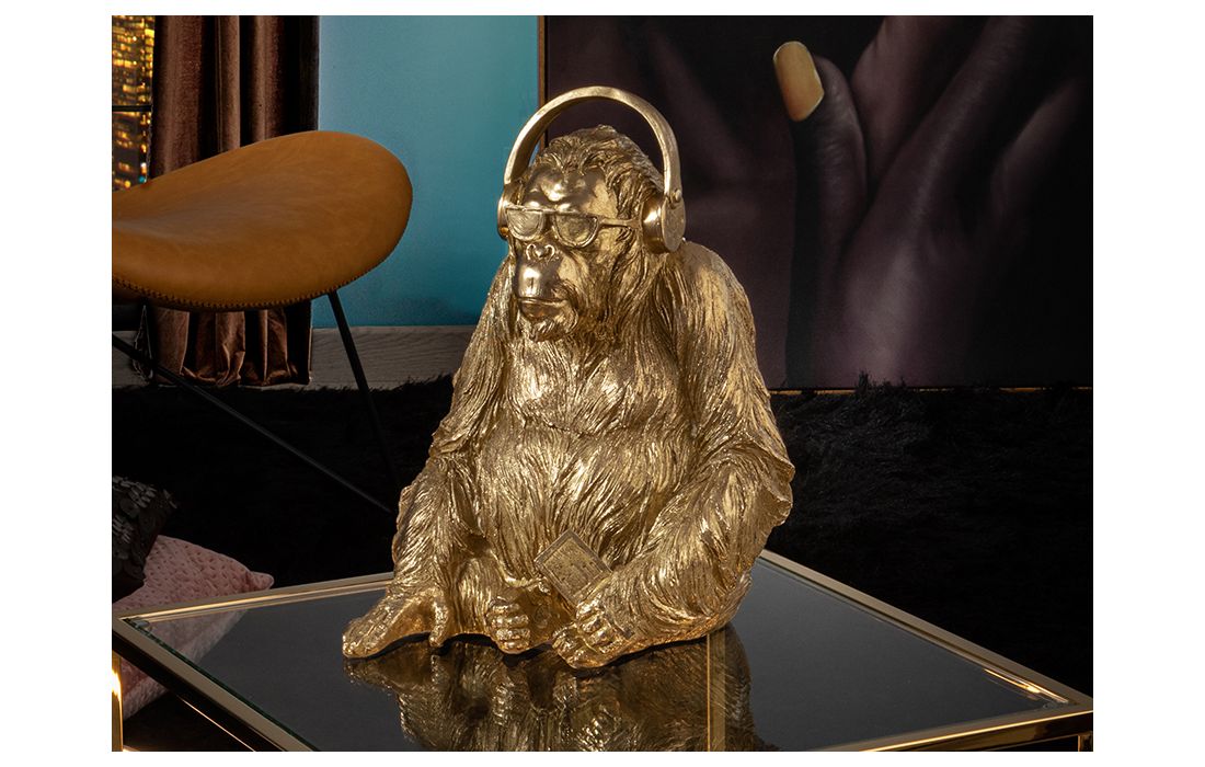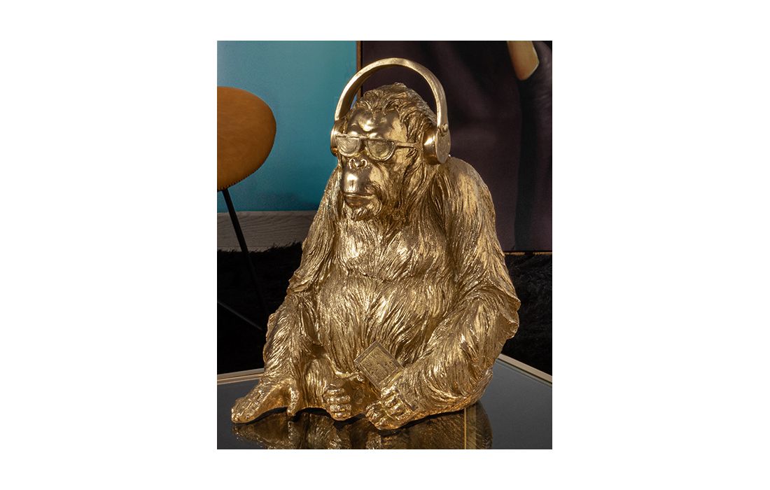 Figura de orangotango com auscultadores e óculos. Realizada em polirresina, acabamento em folha de ouro.