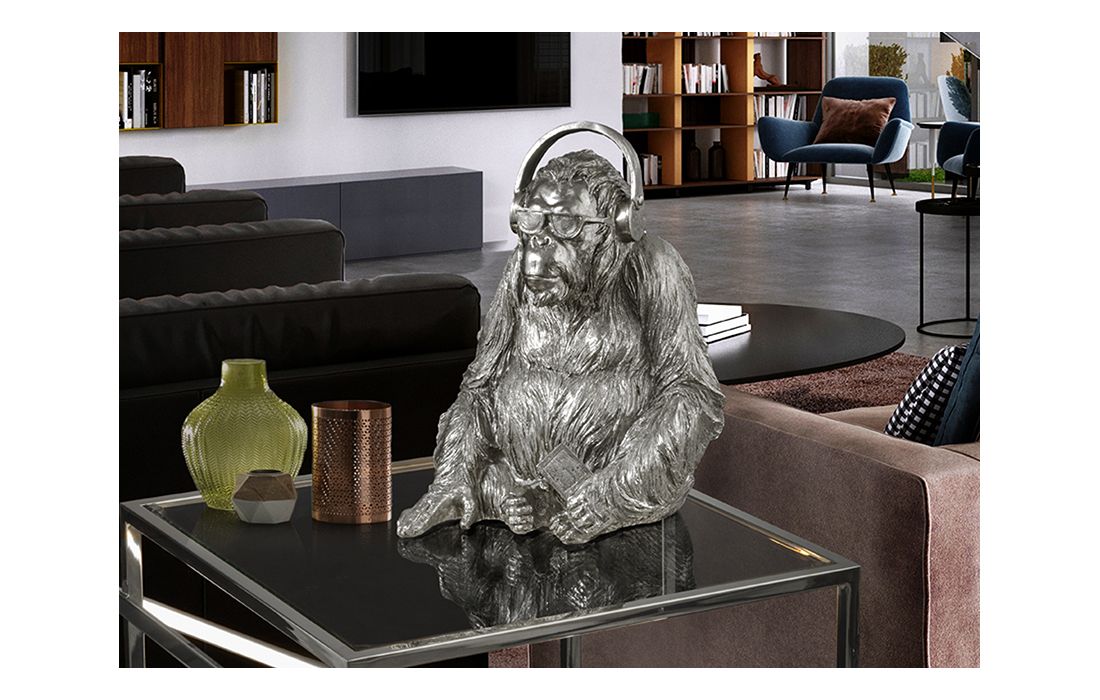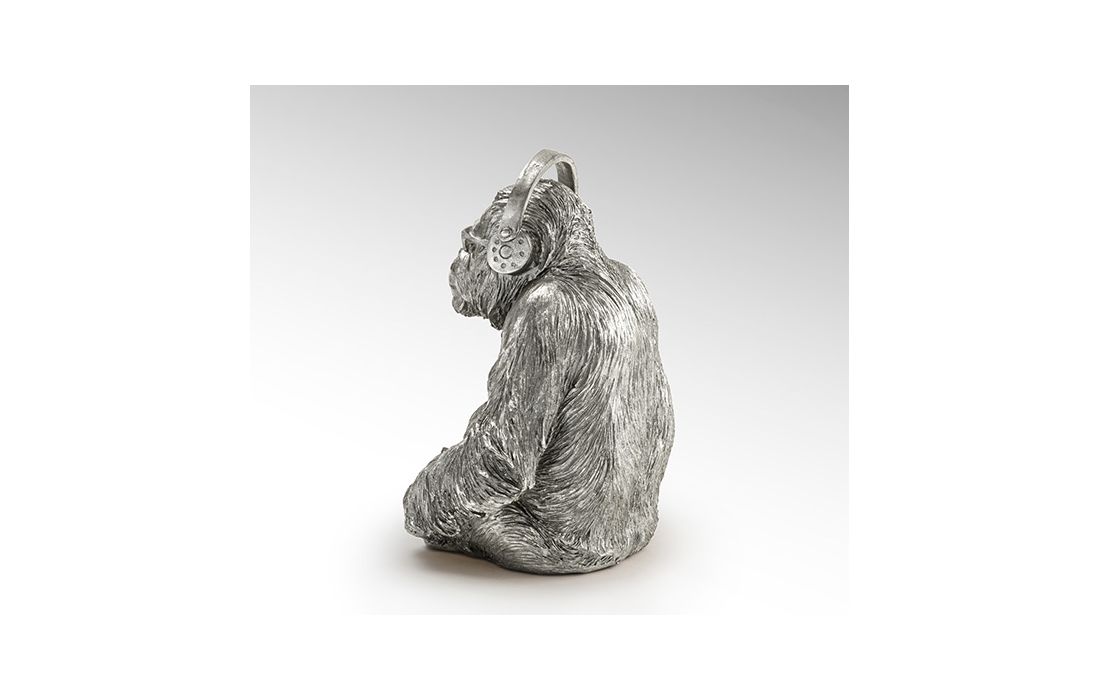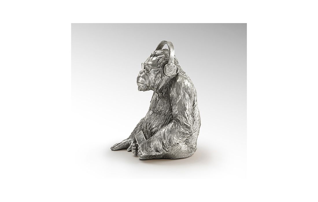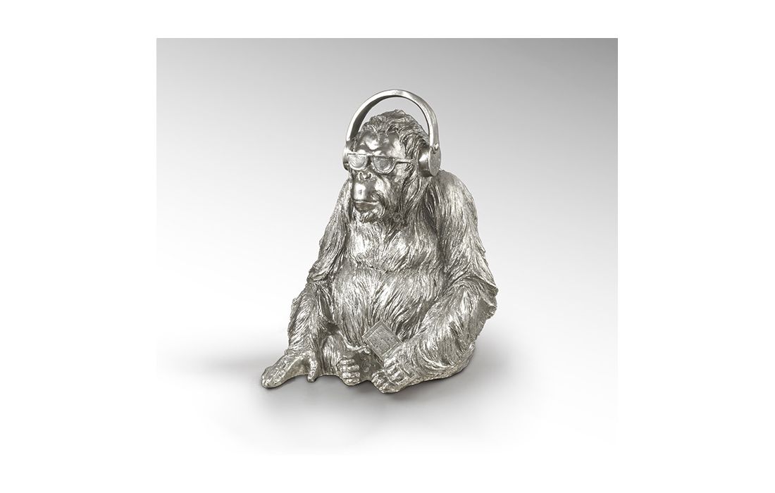 Figura de orangotango com auscultadores e óculos. Realizada em poliresina, acabamento em folha de prata