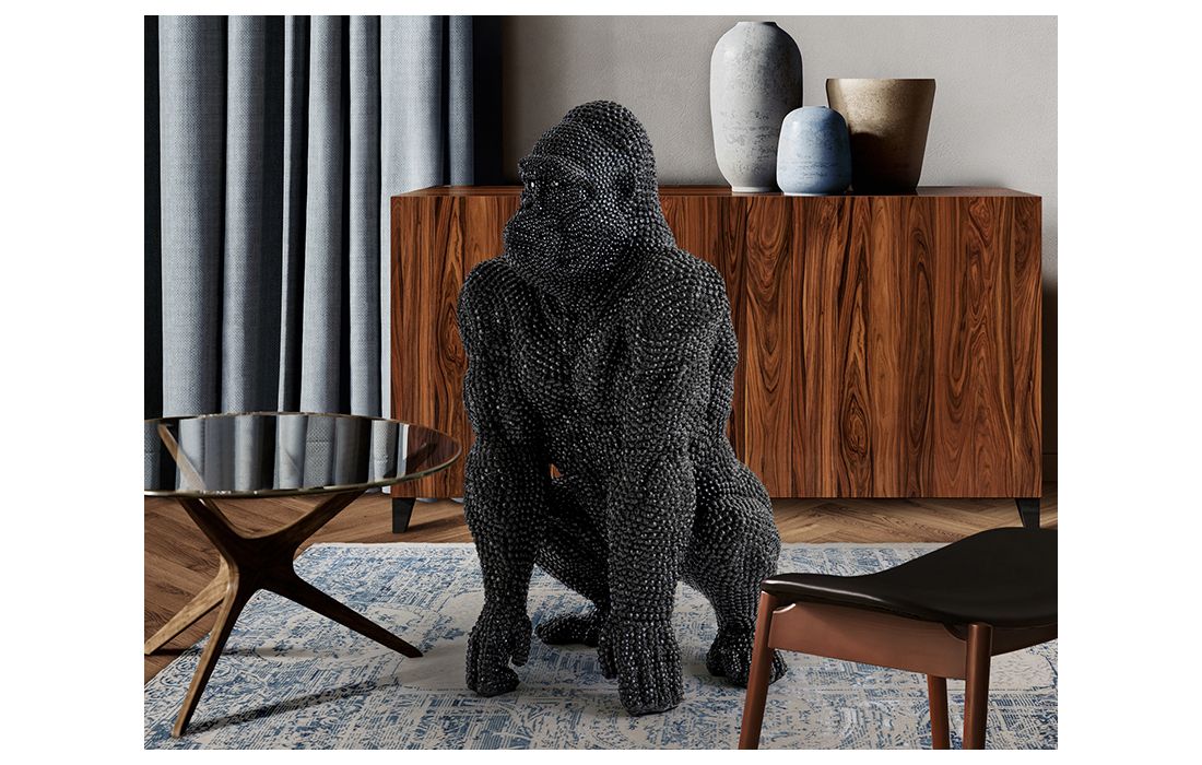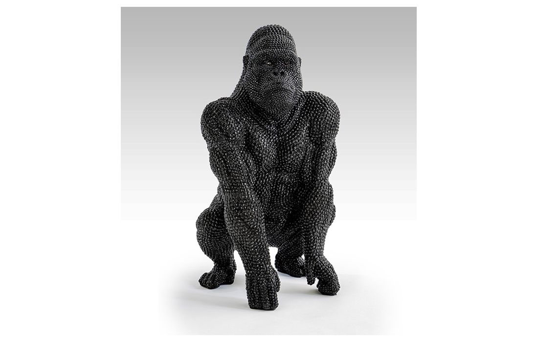 Figura de gorila, realizada em poliresina. Acabamento a preto brilhante com textura imitação de incrustações de pedras