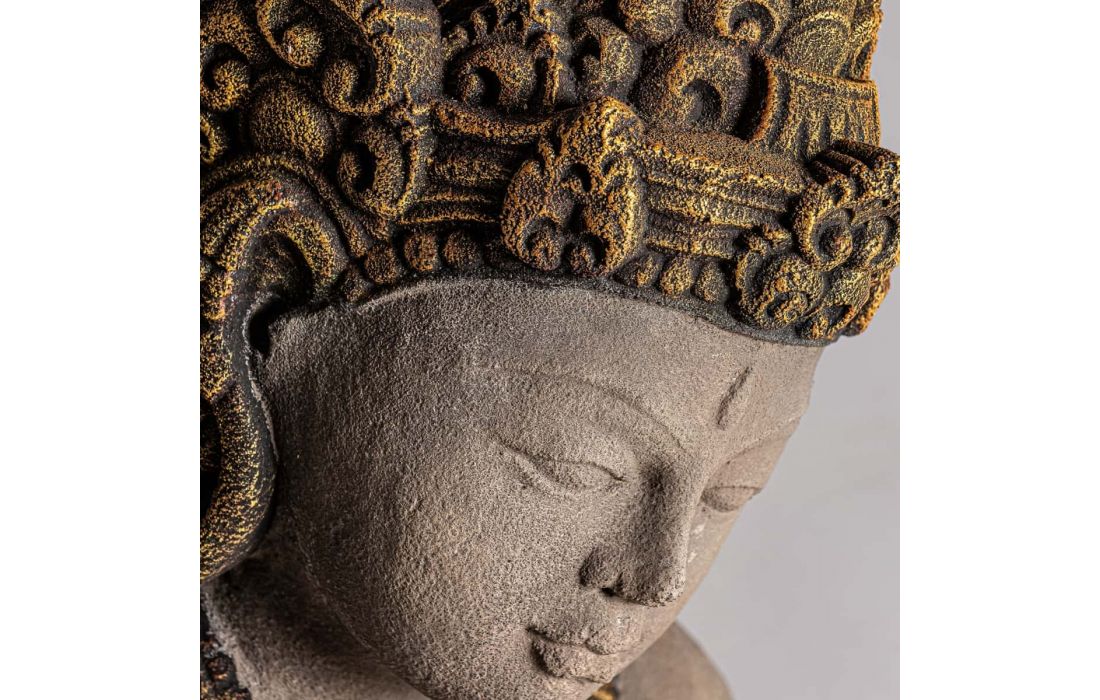 Peça decorativa estilo oriental feito de pedra na cor cinzento/ouro envelhecido.