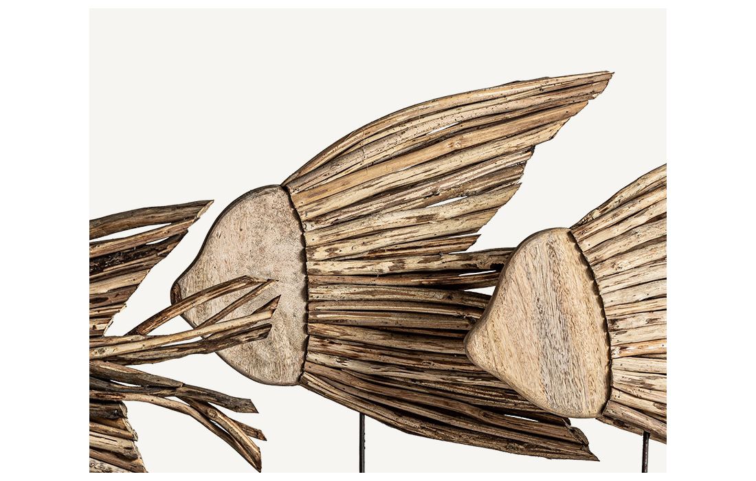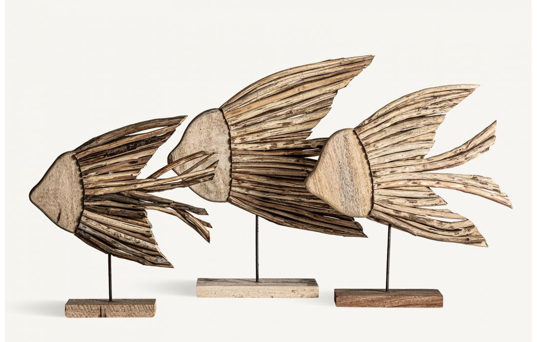 Conjunto de 3 figuras decorativas feitas à mão de estilo étnico em madeira de teka cor natural