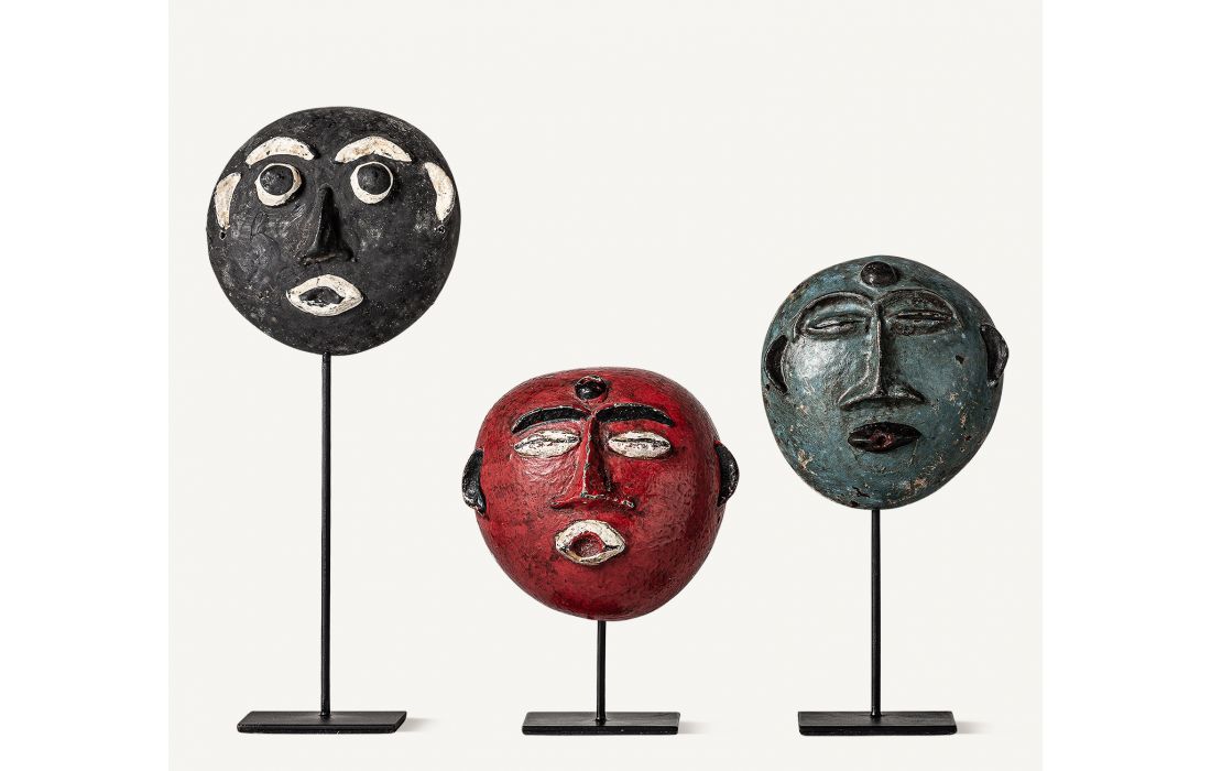 Conjunto de 3 figuras decorativas feitas à mão de estilo étnico em madeira de coco multicolor