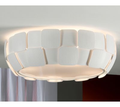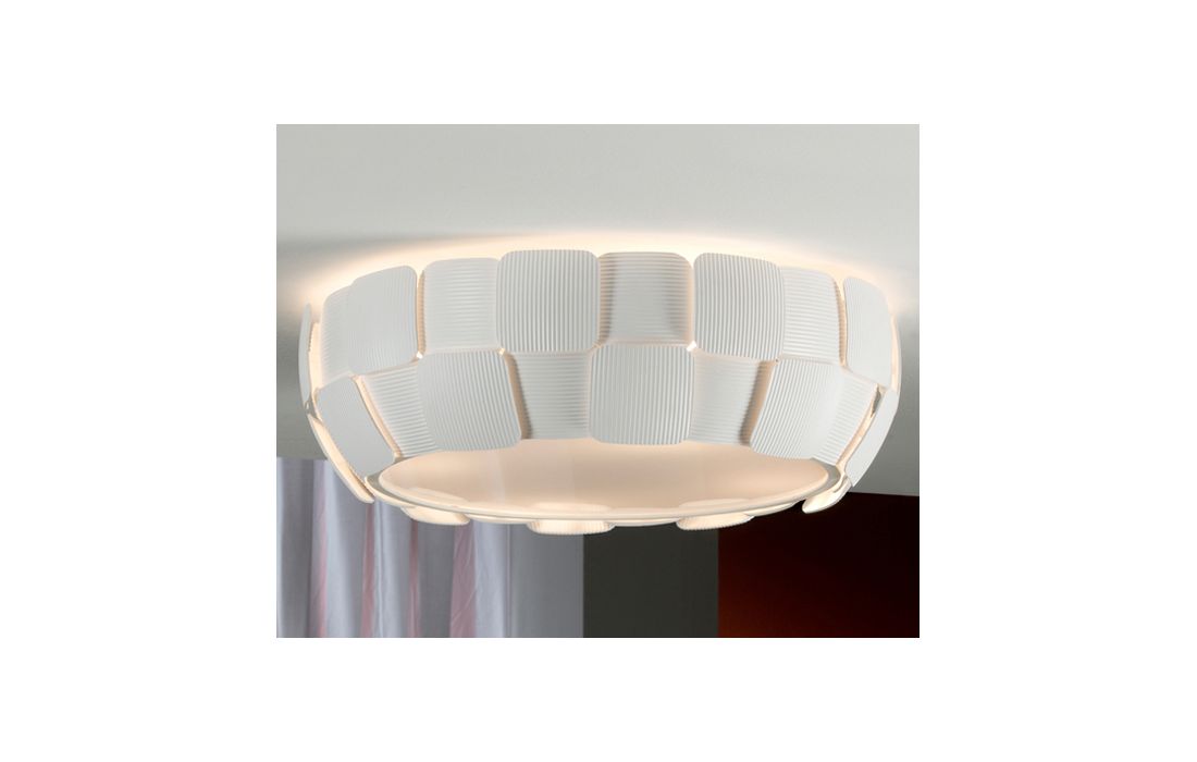Candeeiro de teto com tulipa composta por placas de policarbonato de superfície enrugada. Estrutura realizada em metal, acabamento branco mate. Difusor inferior.