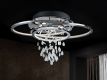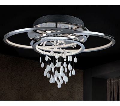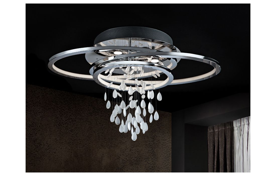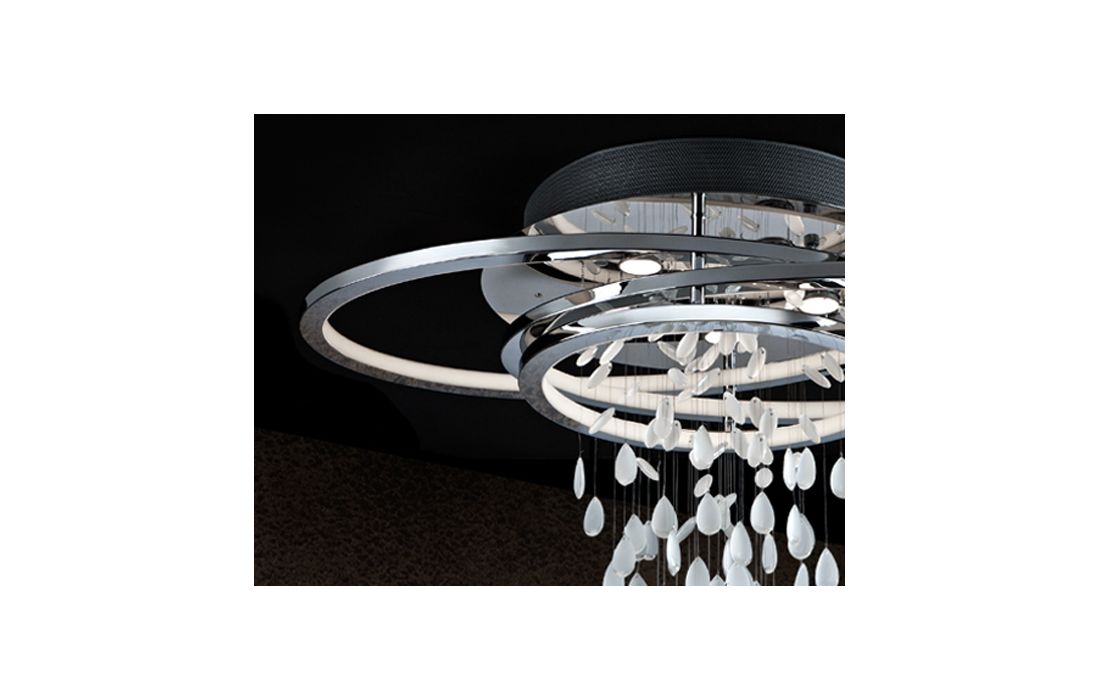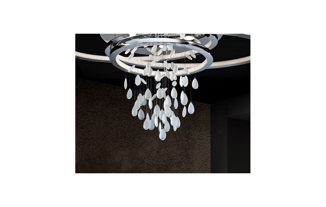 Candeeiro em metal com acabamento em cromado. Lágrimas e amêndoas de vidro branco com fio transparente. Óvalos com iluminação LED e difusor de metacrilato branco. Tira LED 68W. 3000 K.