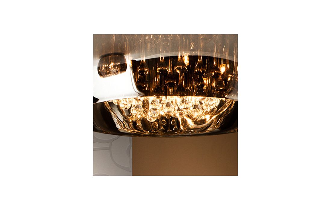 Candeeiro em metal com acabamento em cromado. Tulipa de vidro espelhado e lágrimas interiores de vidro tipo murano.