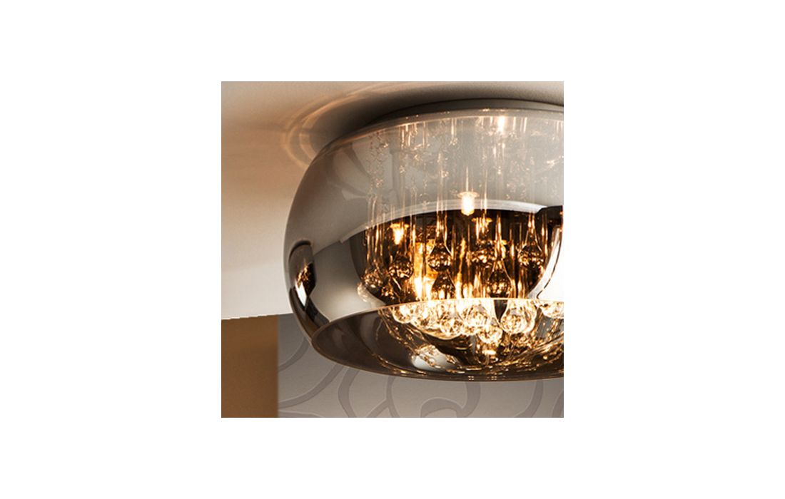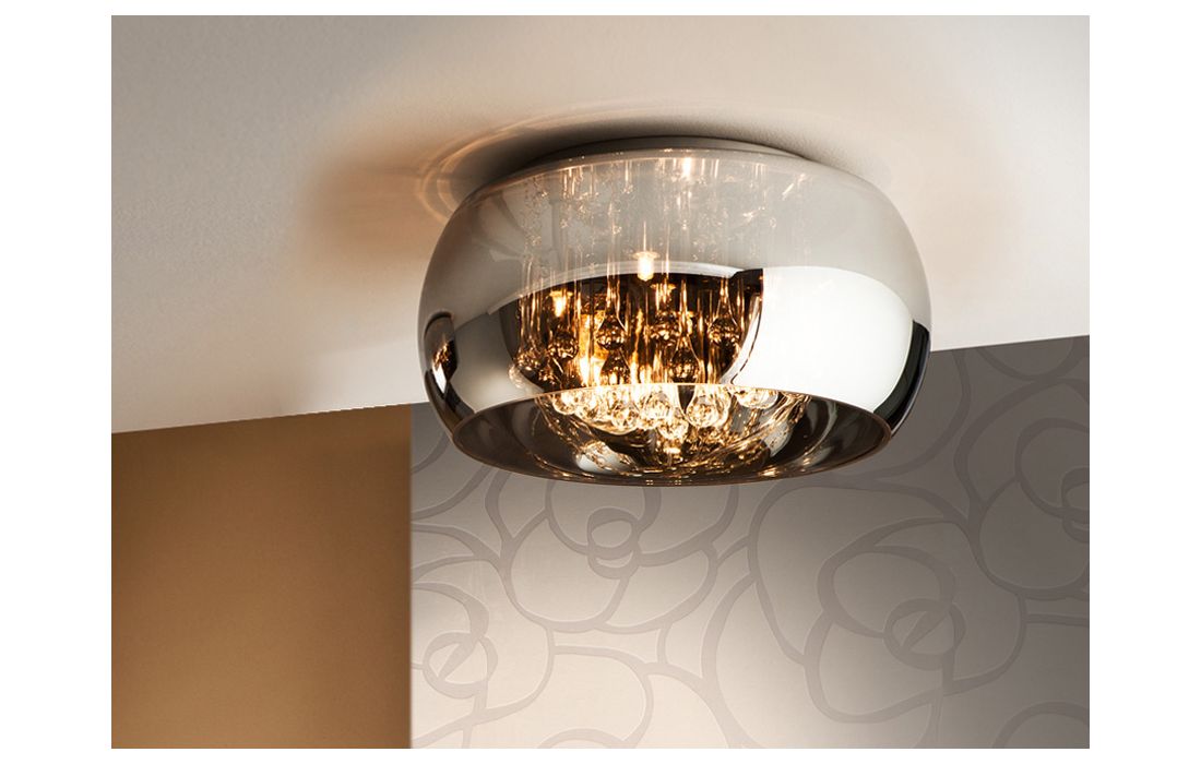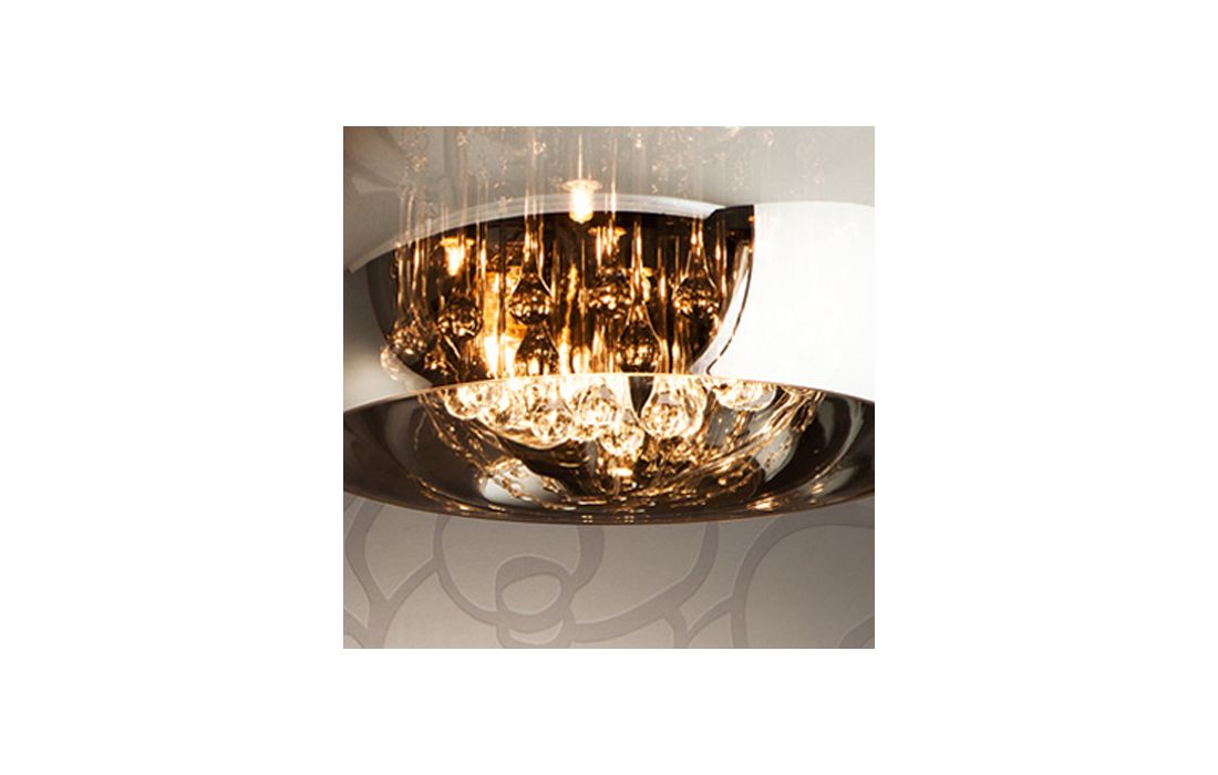 Candeeiro em metal com acabamento em cromado. Tulipa de vidro espelhado e lágrimas interiores de vidro tipo murano.