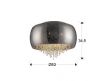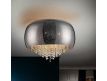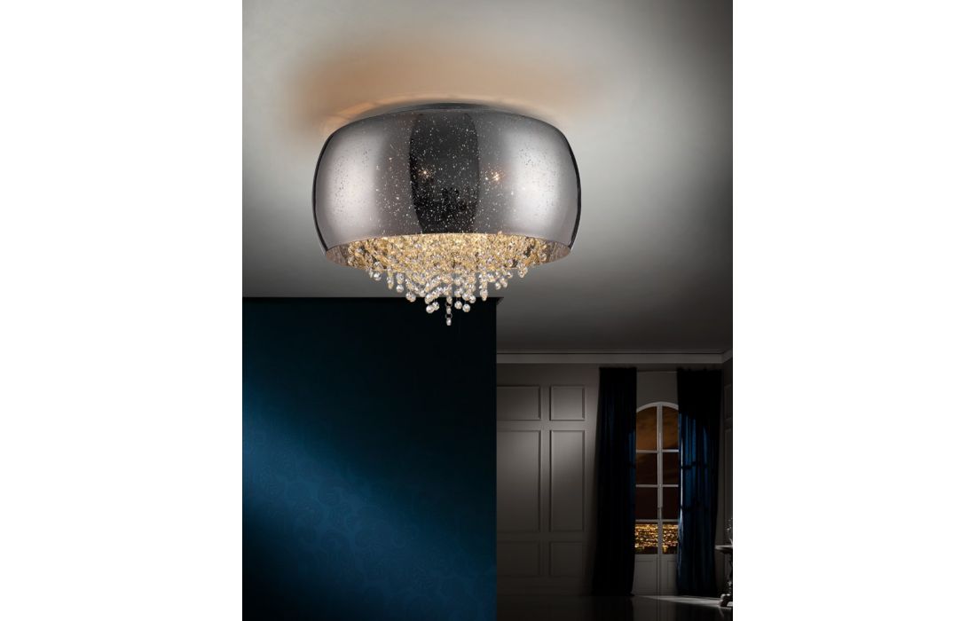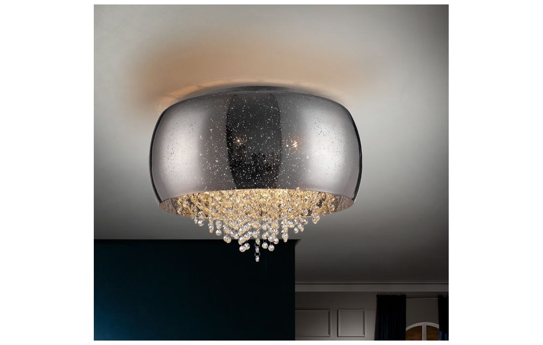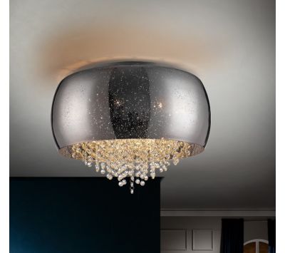 Candeeiro de teto feito em metal com acabemento crómio. Tulipa de vidro em cor prateada espalhada com efeito estrelado e tiras de cristal facetado.