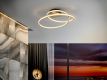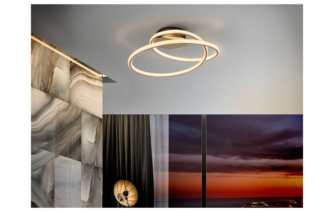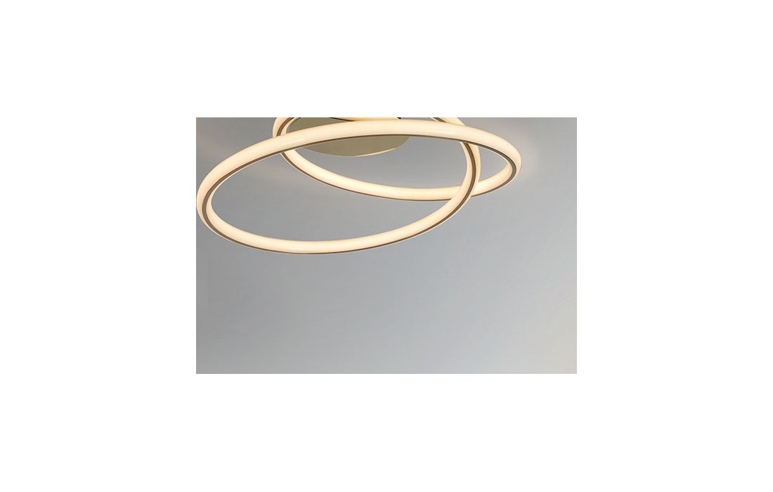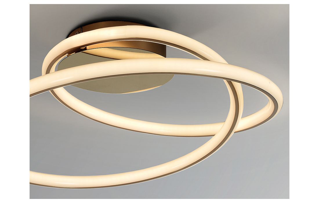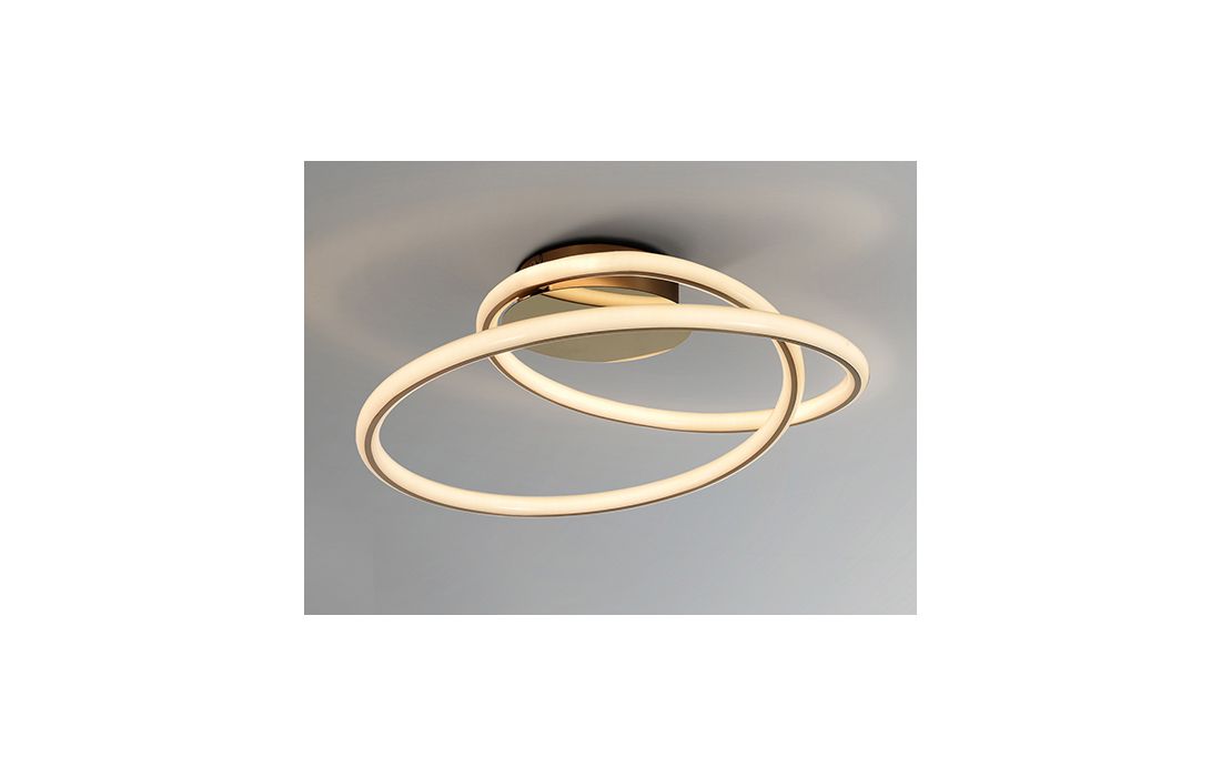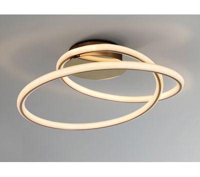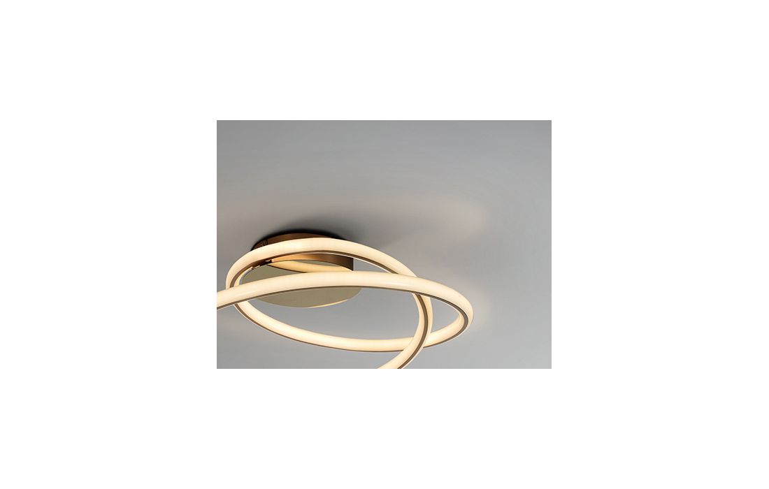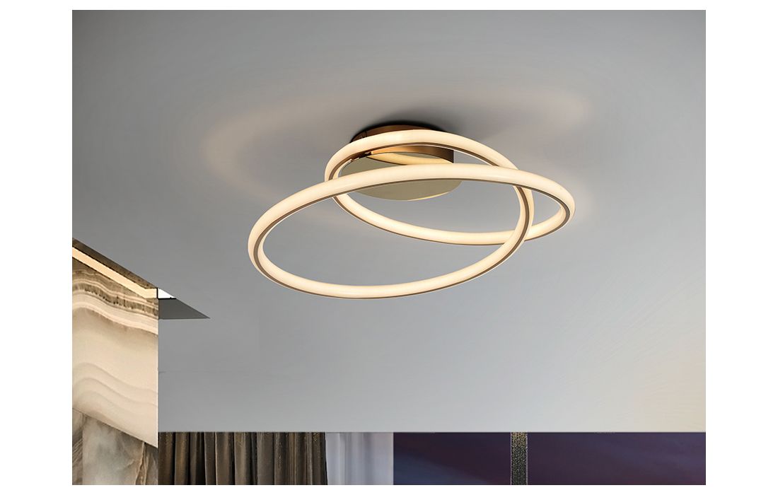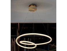 Candeeiro de teto em metal e alumínio. Acabamento dourado brilho e dourado mate. Difusor tubular de silicone opalino.