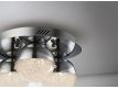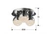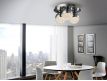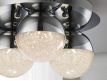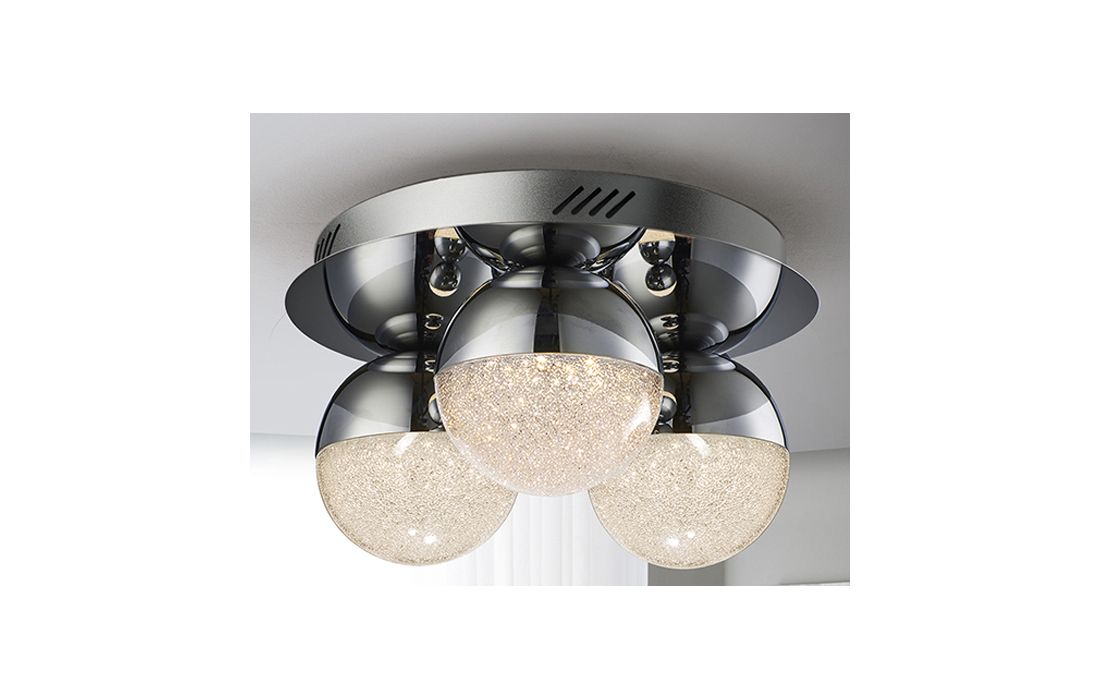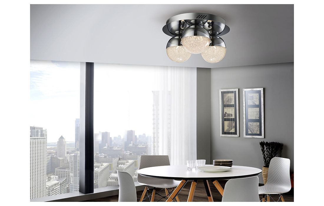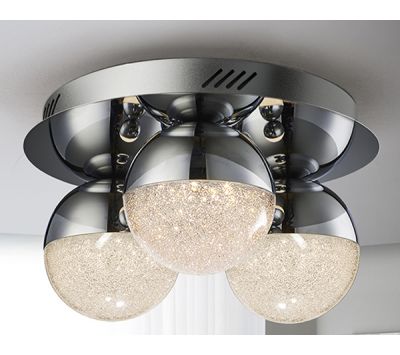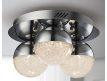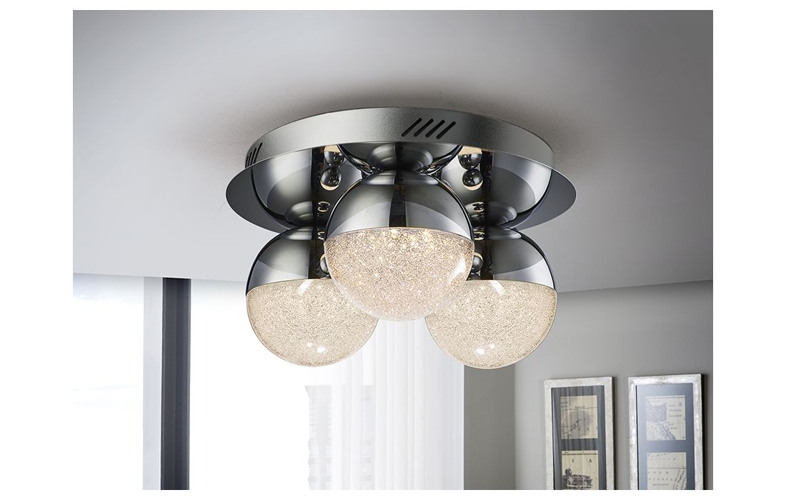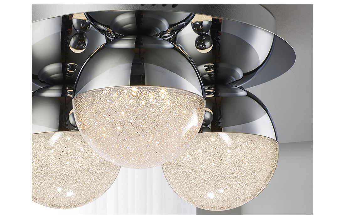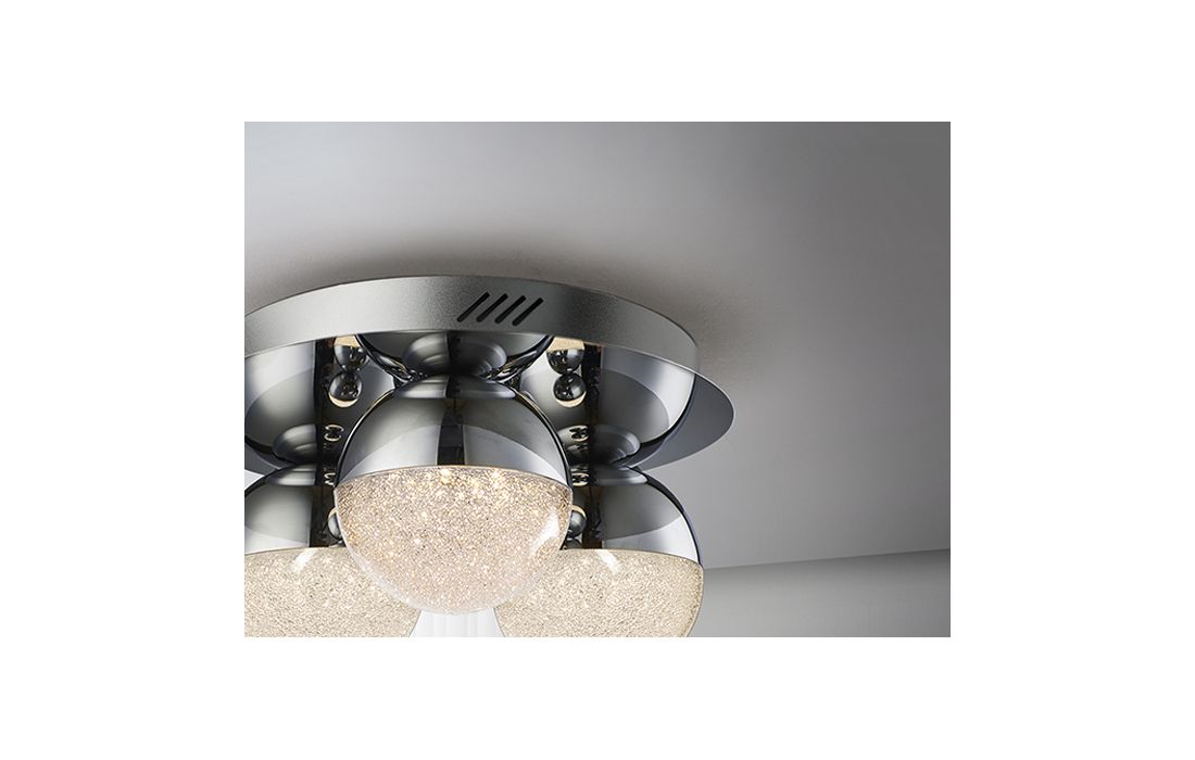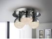 Candeeiro de teto de 3 luzes LED, realizado em metal acabamento crómio. Tulipas esféricas de 12 cm de policarbonato com interior texturizado e metal cromado.