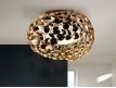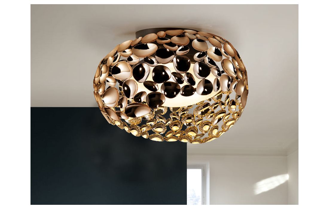 Candeeiro de teto de 5 luzes LED, realizado em metal com banho de ouro e pintura castanha escura. Difusor acrílico interior.