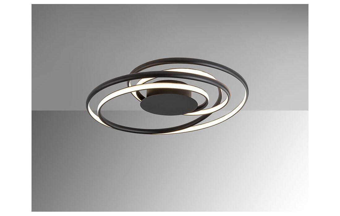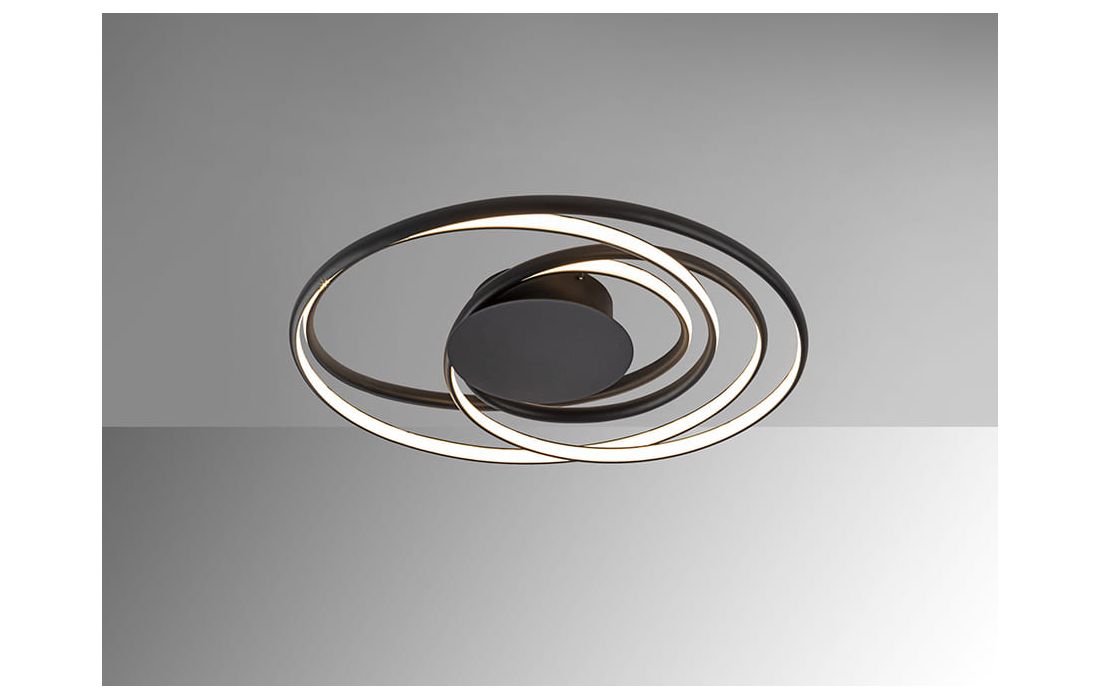 Candeeiro de teto em metal e alumínio, acabamento preto mate arenado. Difusor opalino de silicone.