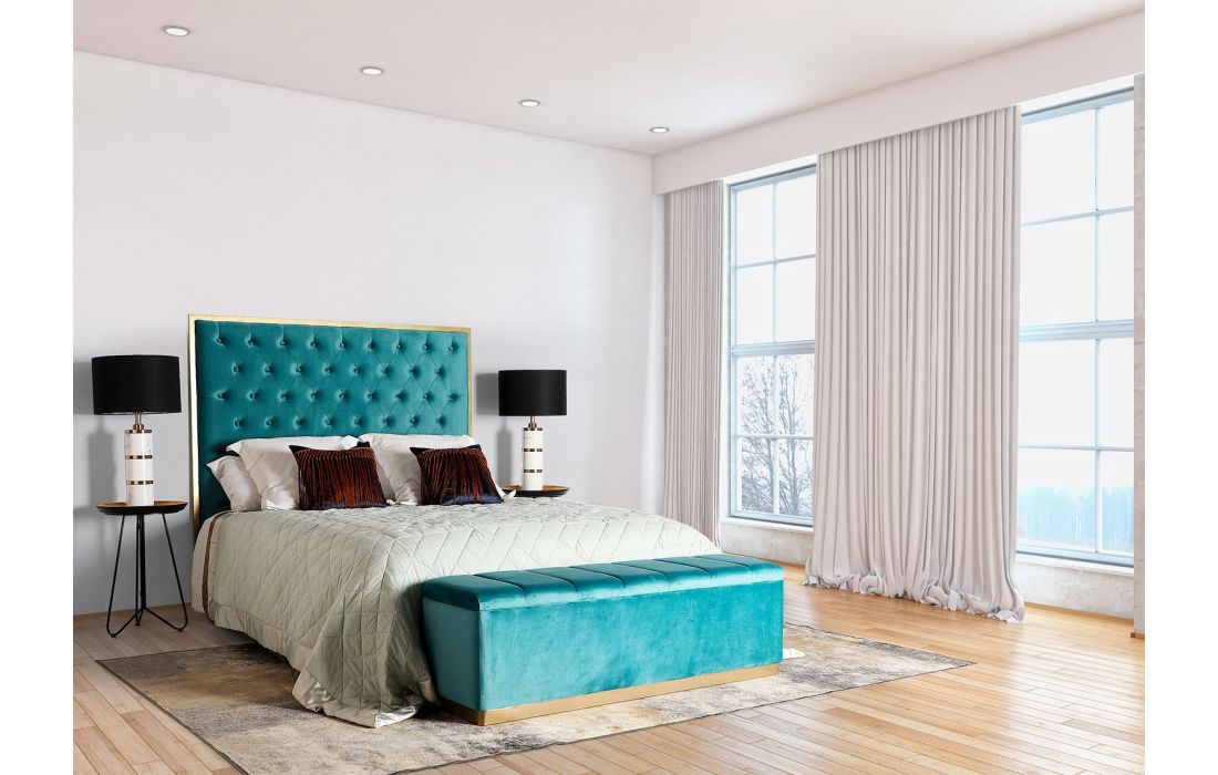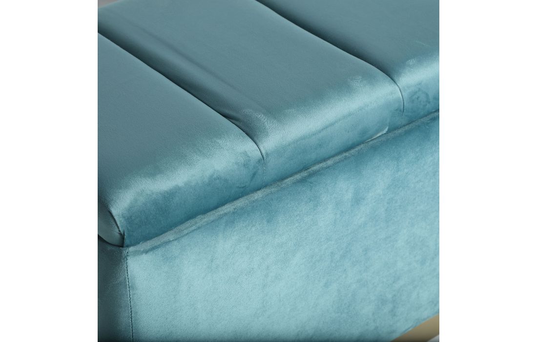 Banqueta em tecido de veludo azul turquesa e aço na cor dourado, com arrumação