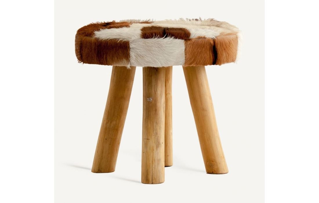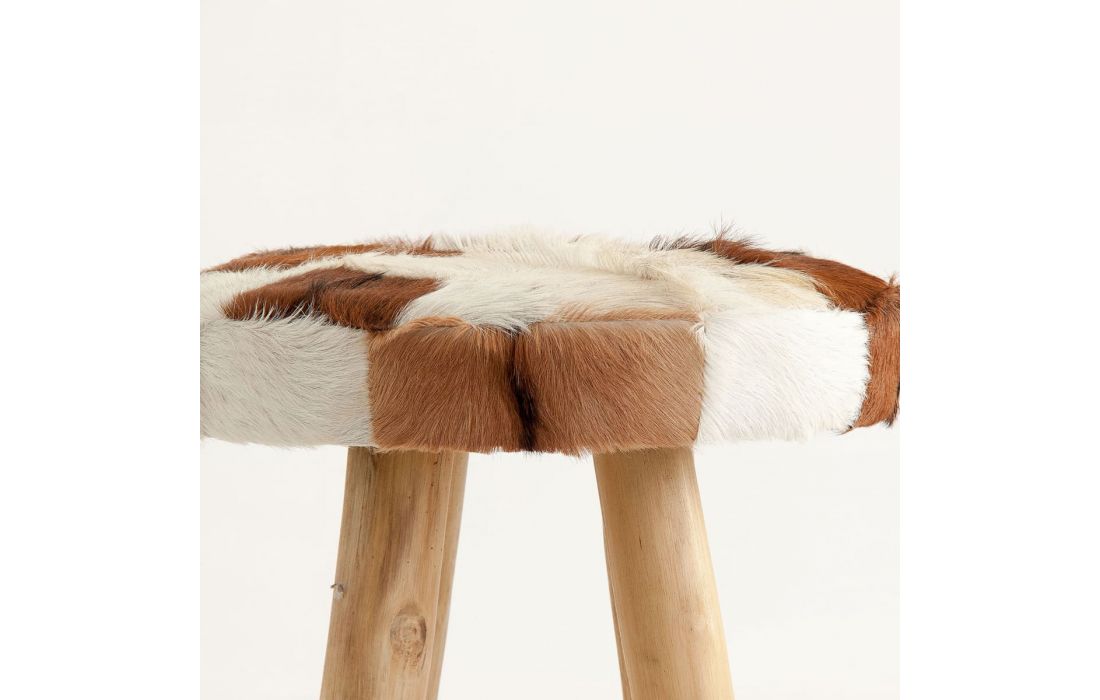 Banqueta estilo nórdico feita em madeira de pinho e couro de cabra nas cores castanha e brancaDimensões em cm