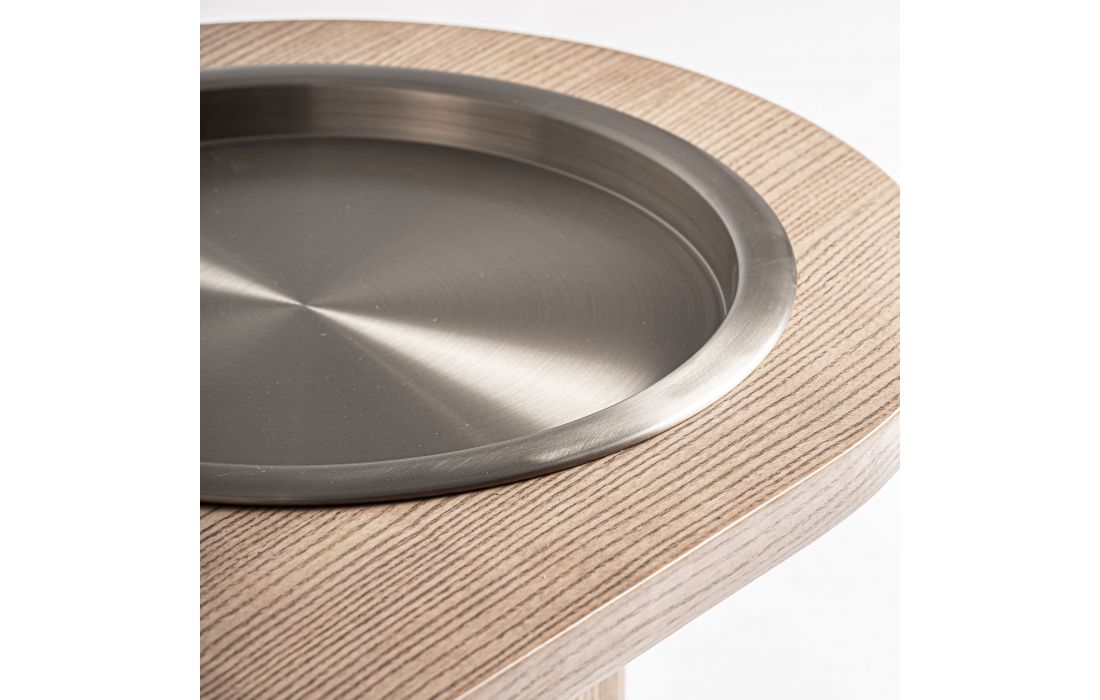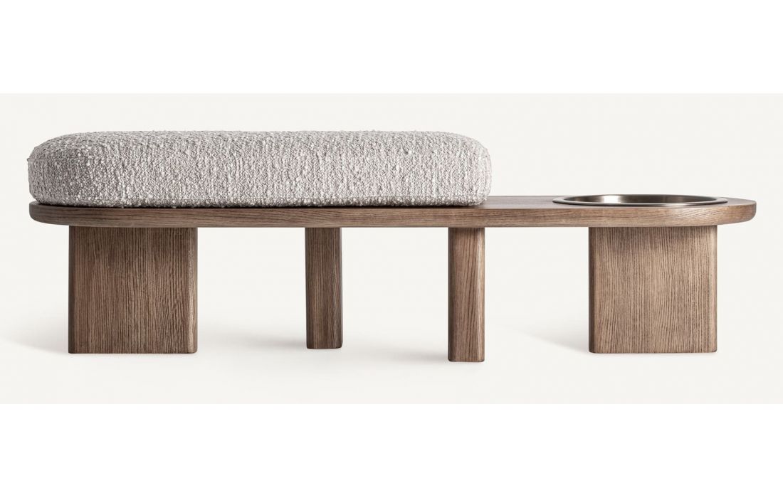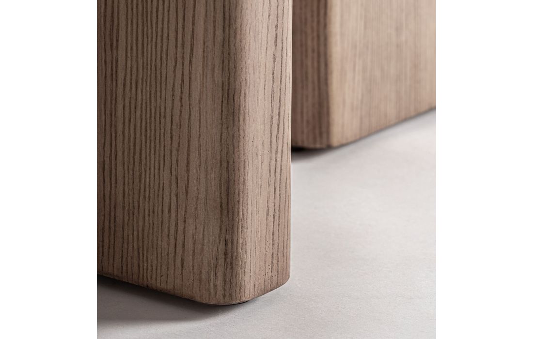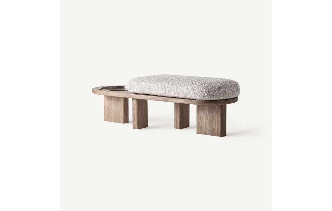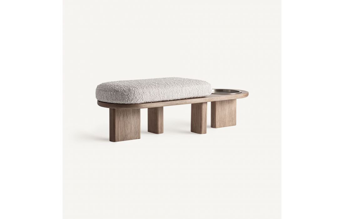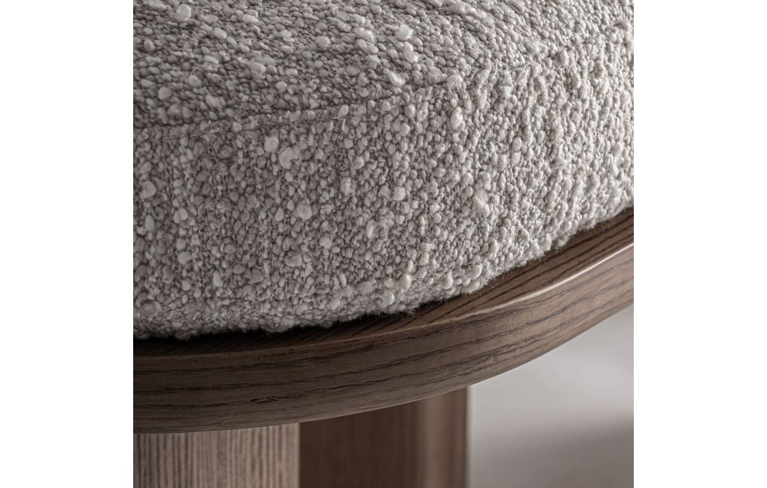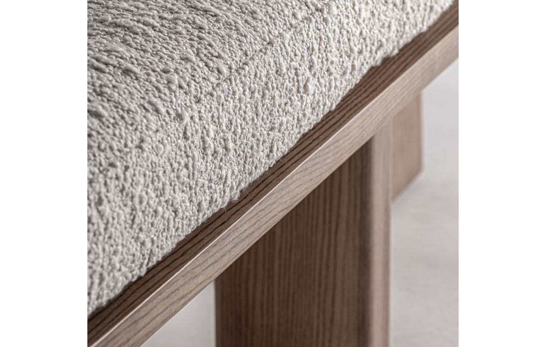 Esta banqueta traz um toque natural e equilibrado. Folheada a carvalho, com revestimento a tecido e com aço inoxidável, oferece uma presença leve e funcional a qualquer espaço.