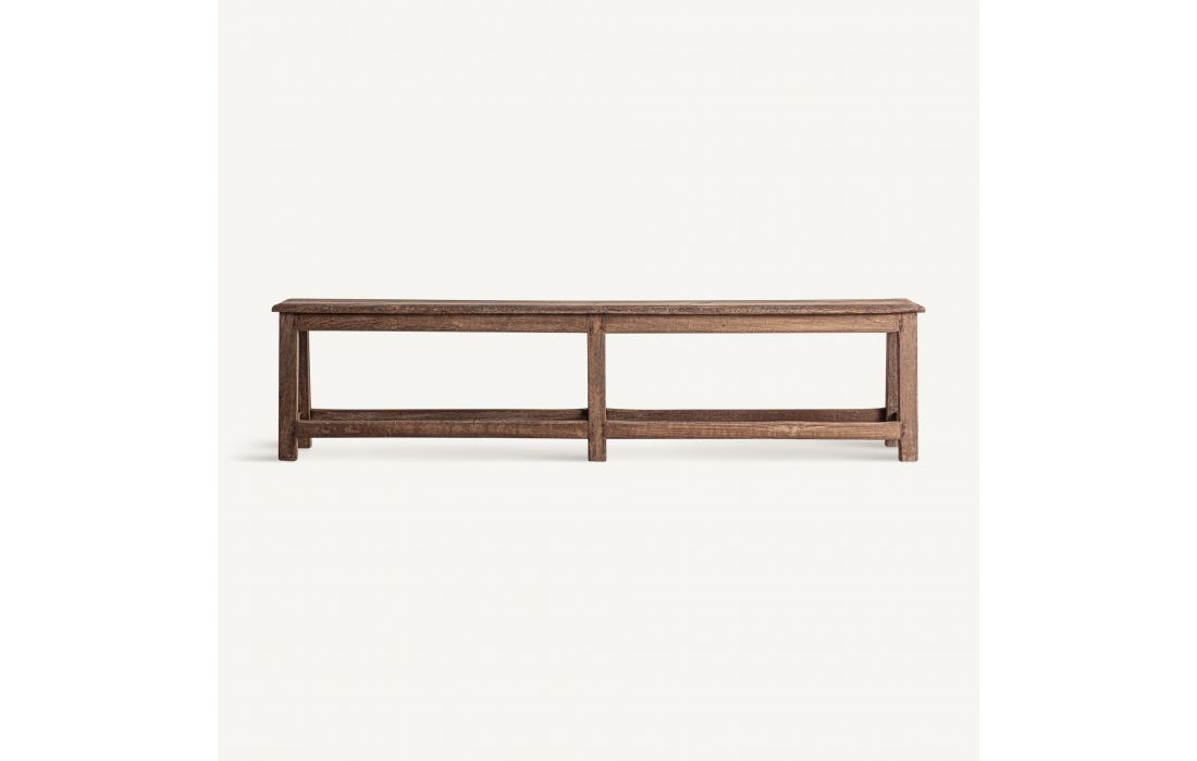 Esta banqueta feita em madeira de teca com acabamento envelhecido, tem um estilo étnico que realça o ambiente.