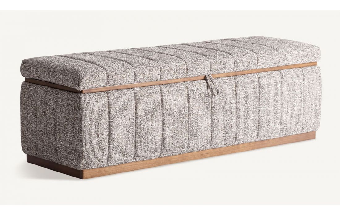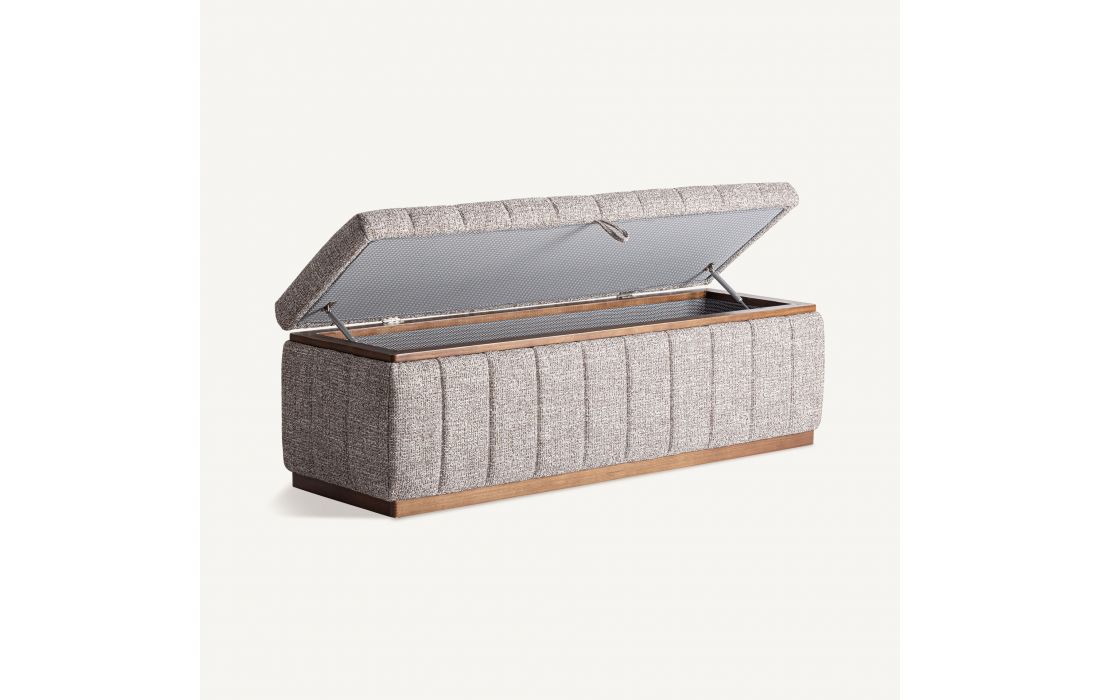 O assento estofado em tecido proporciona conforto, enquanto a tampa elevatória permite acesso a um prático espaço de arrumação interior.