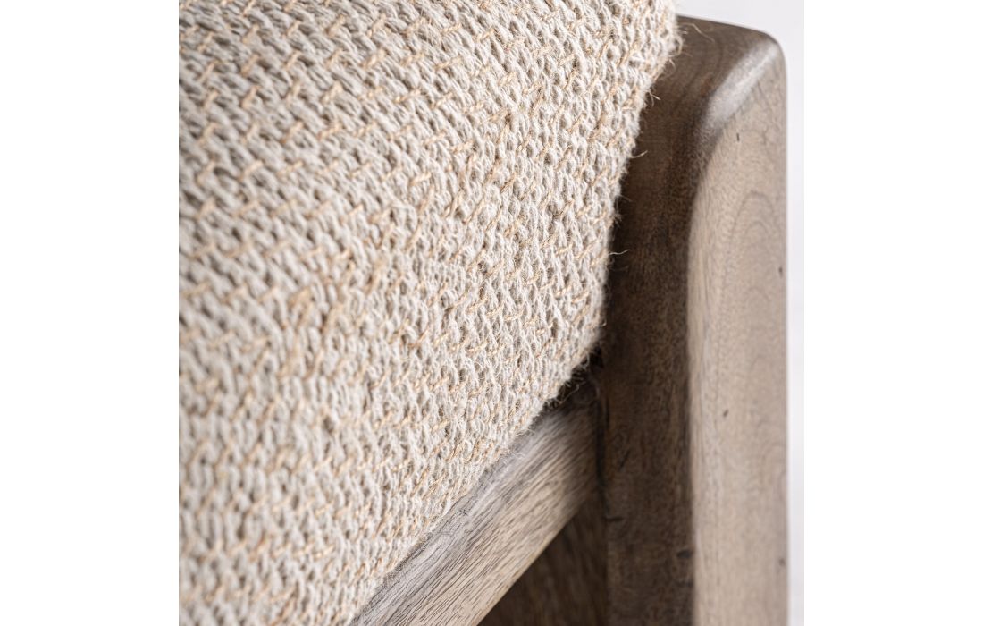 Este banco de bar oferece equilíbrio contemporâneo e textura natural. Fabricado em madeira de mango com assento em tecido, transmite aconchego e sofisticação discreta. Ideal para projetos residenciais e de hotelaria que procuram combinar funcionalidade e design numa única peça.