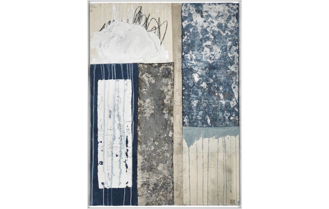 Quadro original do autor Robert Archer, pintura abstrata com moldura de madeira cor branca.