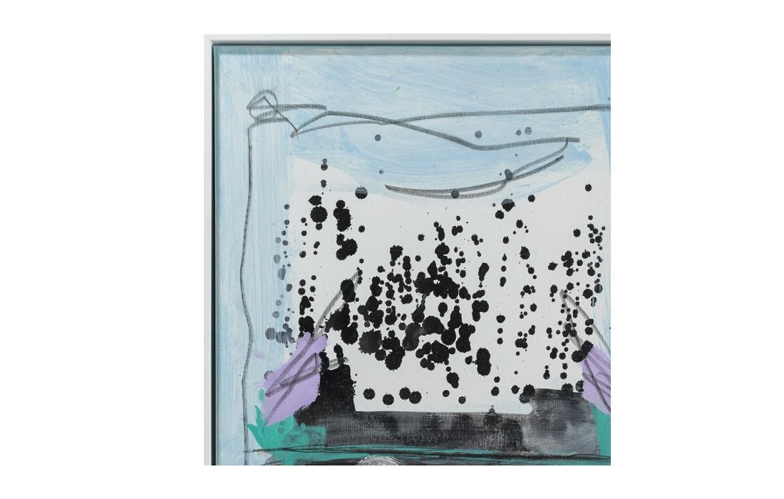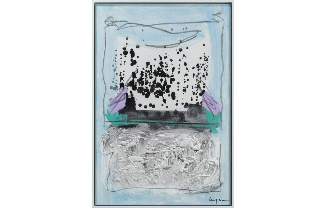 Quadro original do autor César Luque, pintura abstrata em tela com moldura pintada de branco.