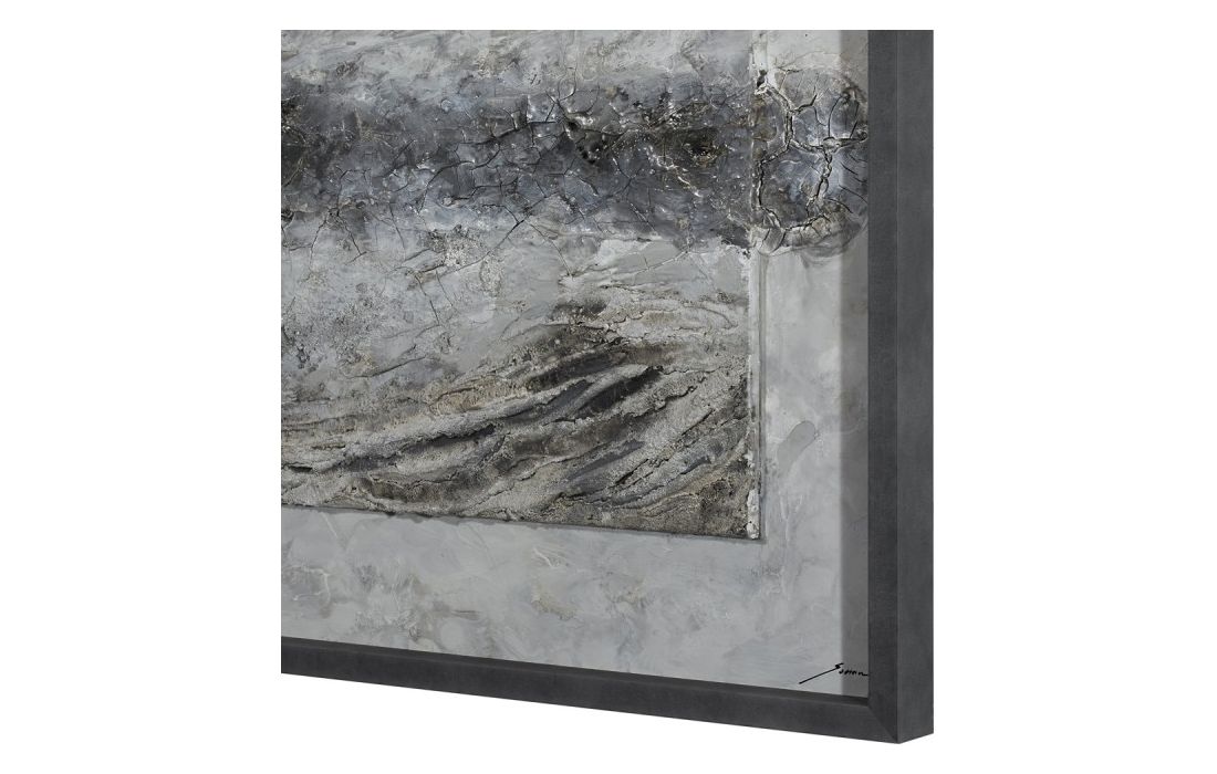 Quadro original do autor Vicente Soriano, pintura abstrata em madeira com moldura em pedra cinza.