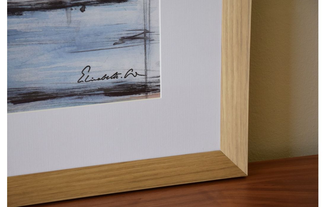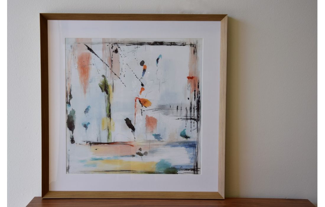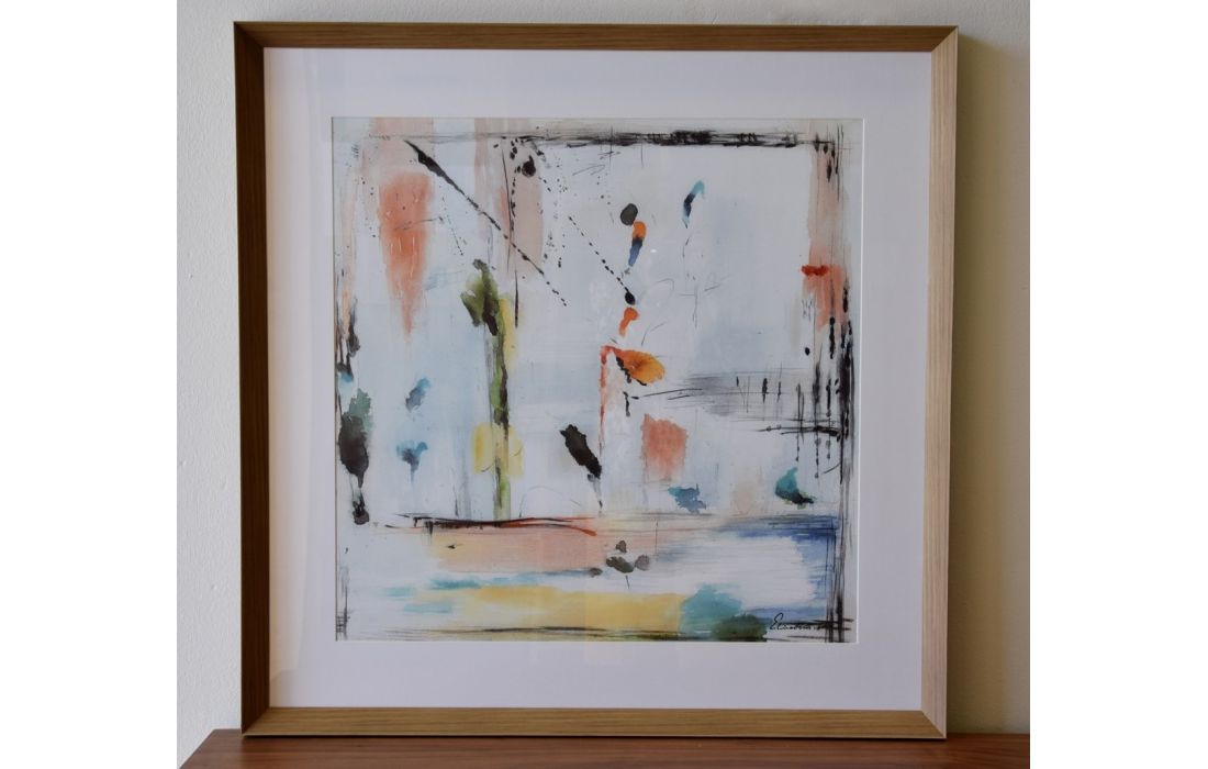 Pintura abstrata com frente em vidro e moldura de madeira.