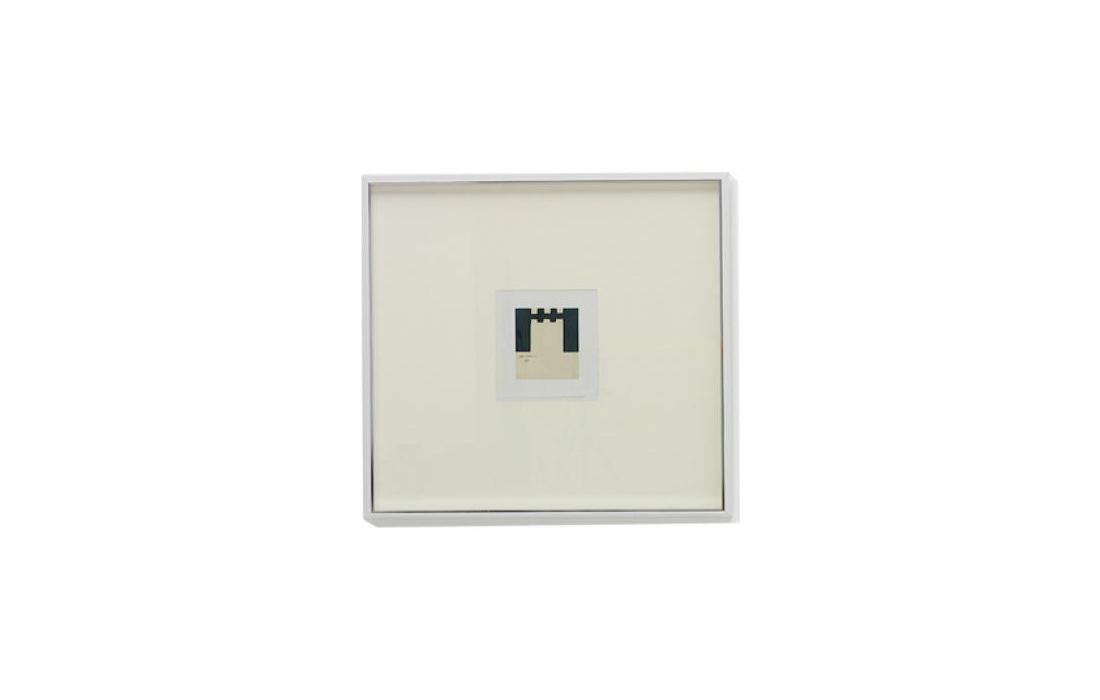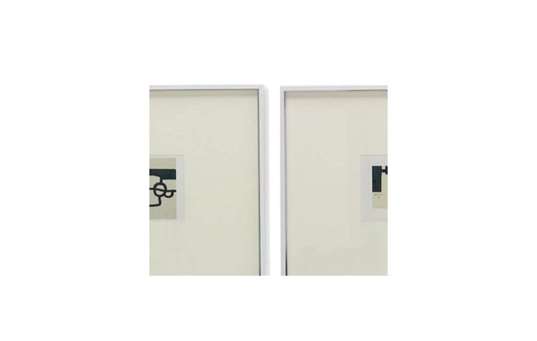 Conjunto de 2 quadros com vidro e moldura de metal cromado branco.