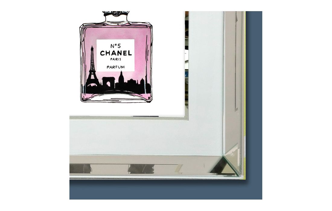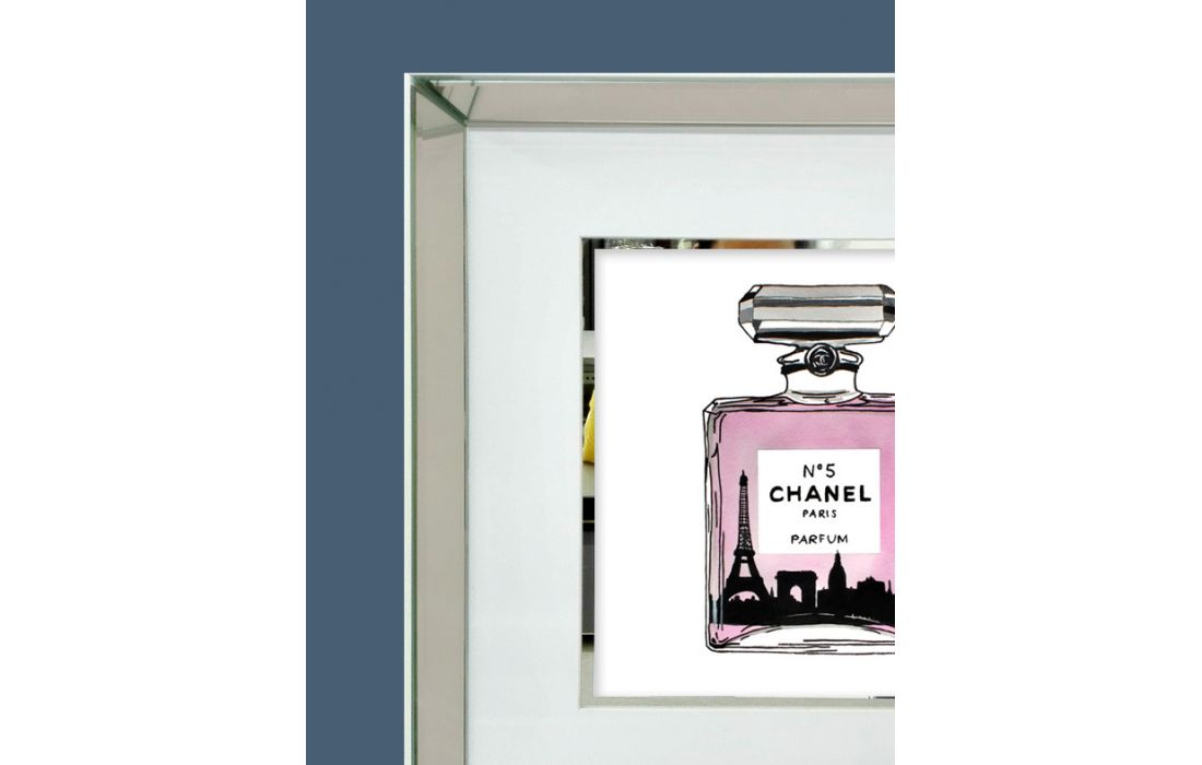 Quadro com impressão, emoldurado com vidro e moldura em lacado branco mate e espelho.
