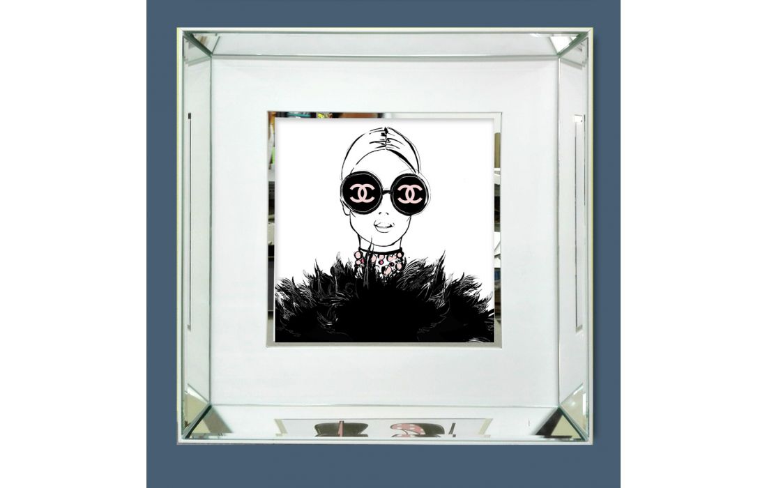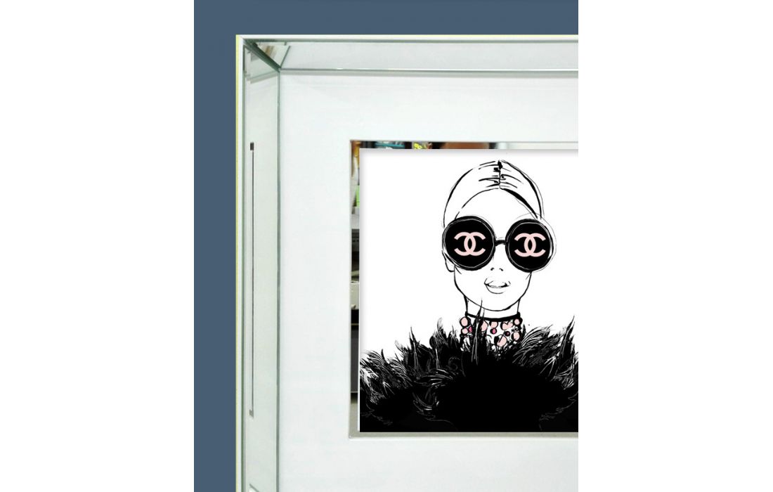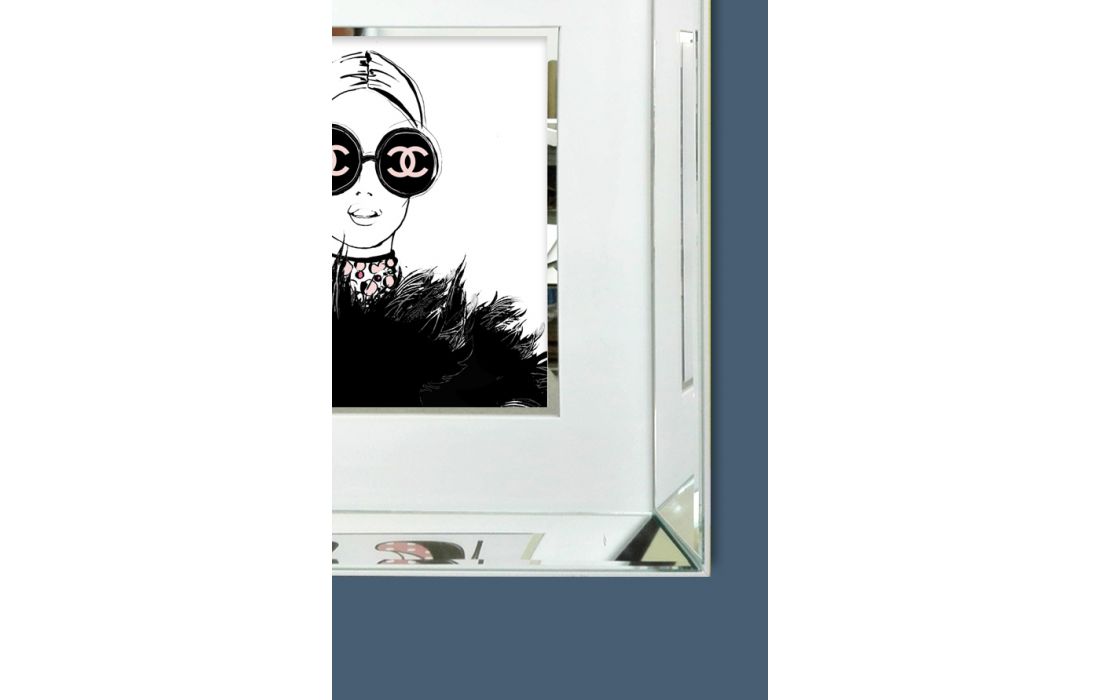Quadro com impressão, emoldurado com vidro e moldura em lacado branco mate e espelho.