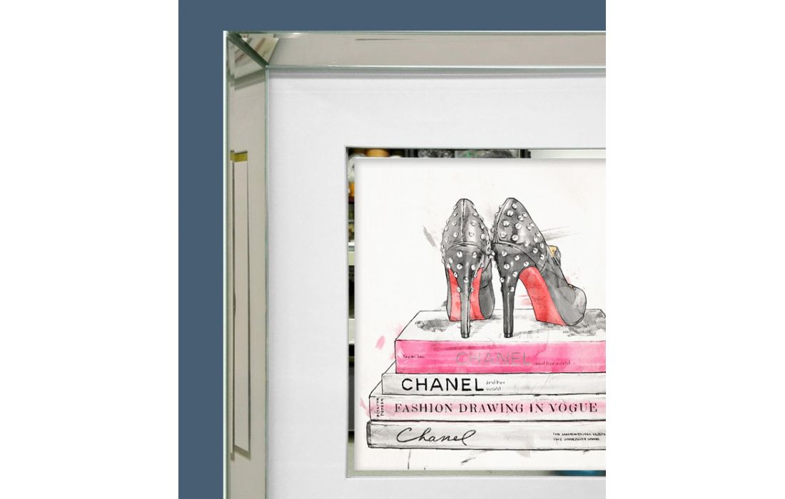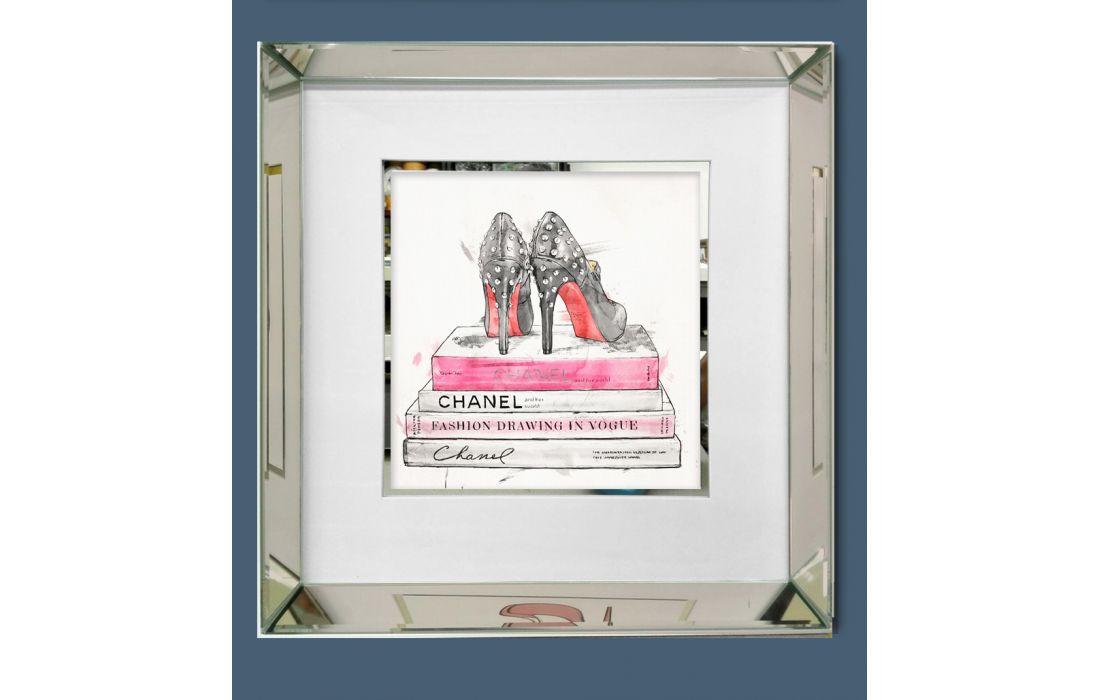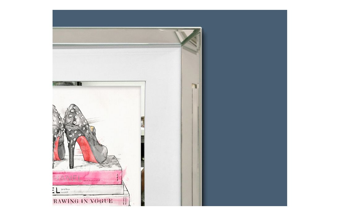Quadro com impressão, emoldurado com vidro e moldura em lacado branco mate e espelho.