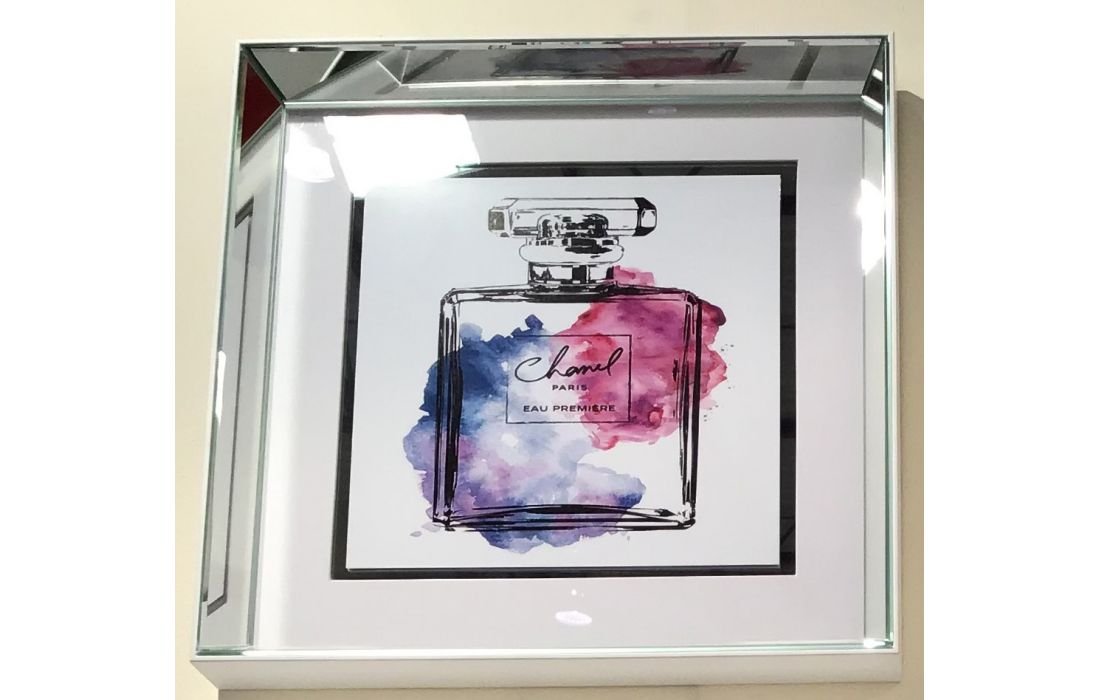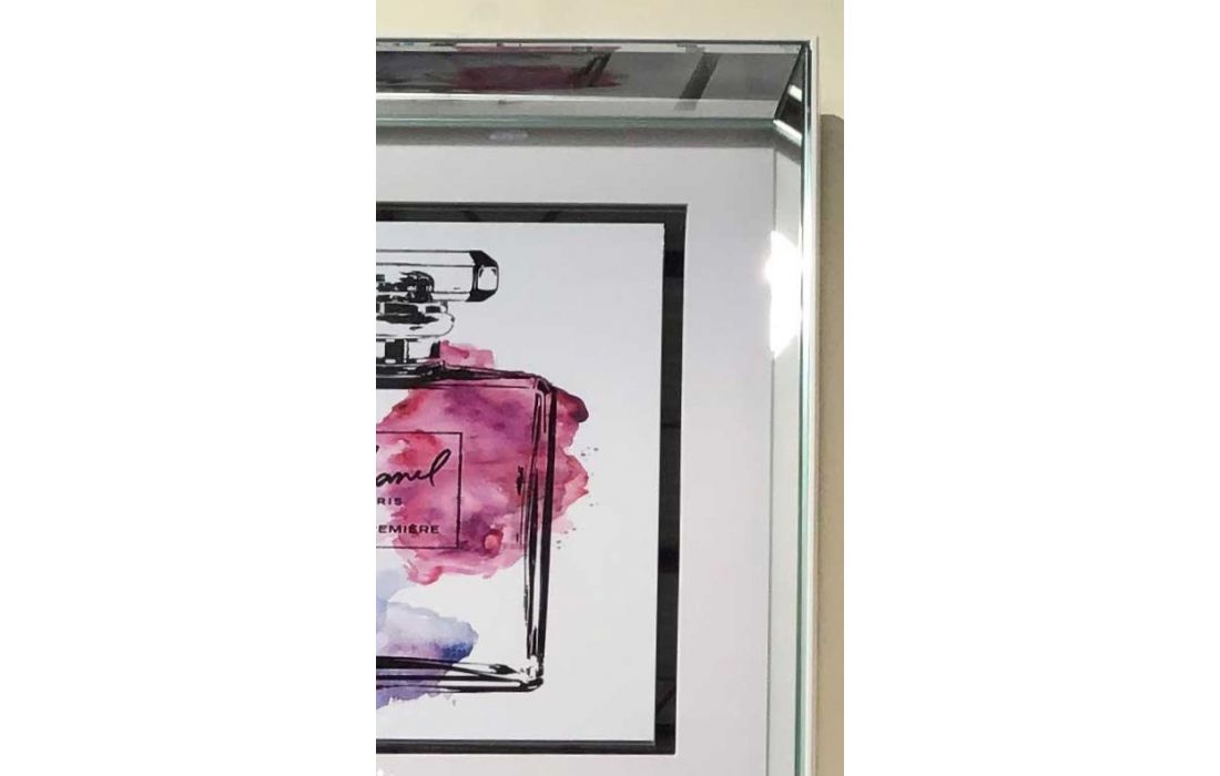 Quadro com impressão, emoldurado com vidro e moldura em lacado branco mate e espelho.