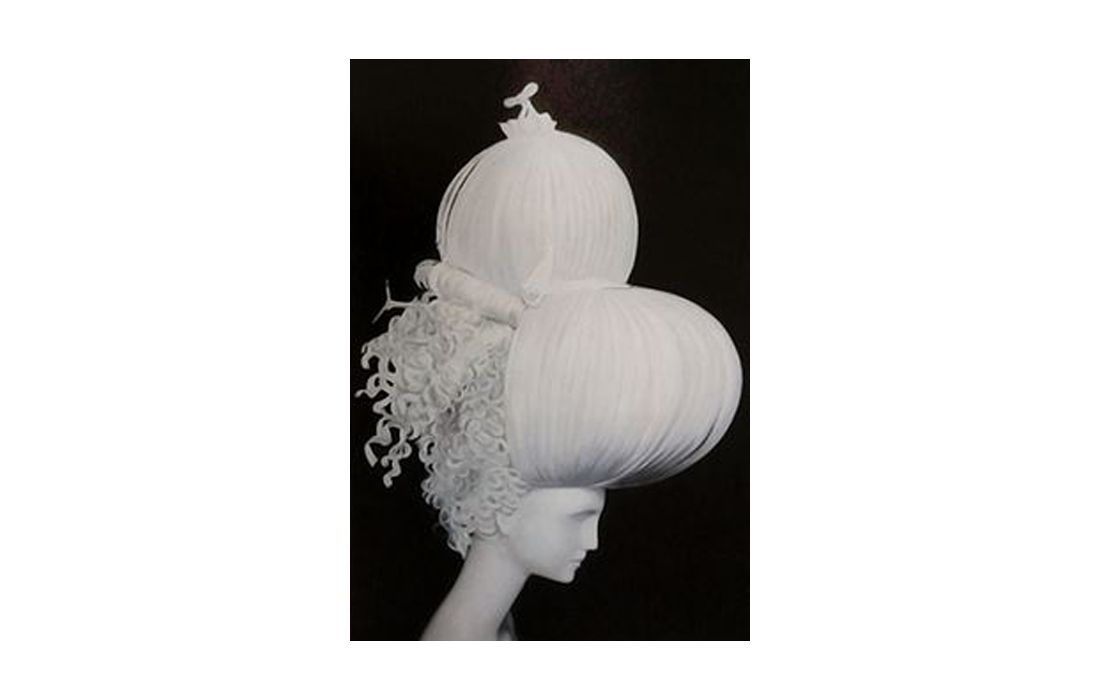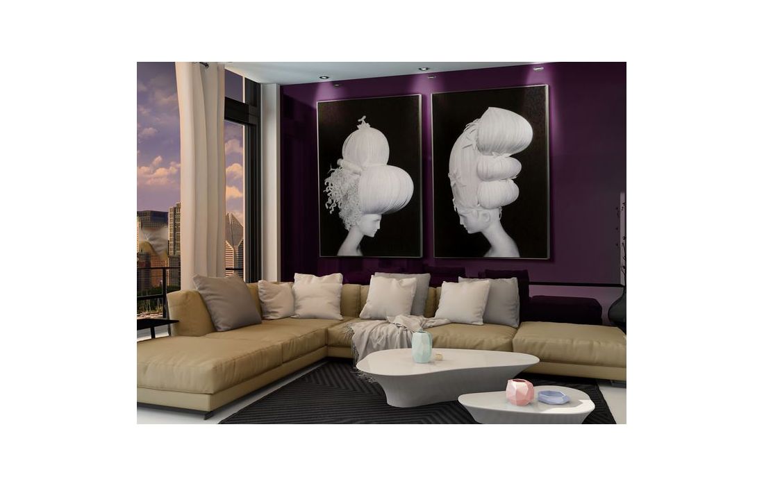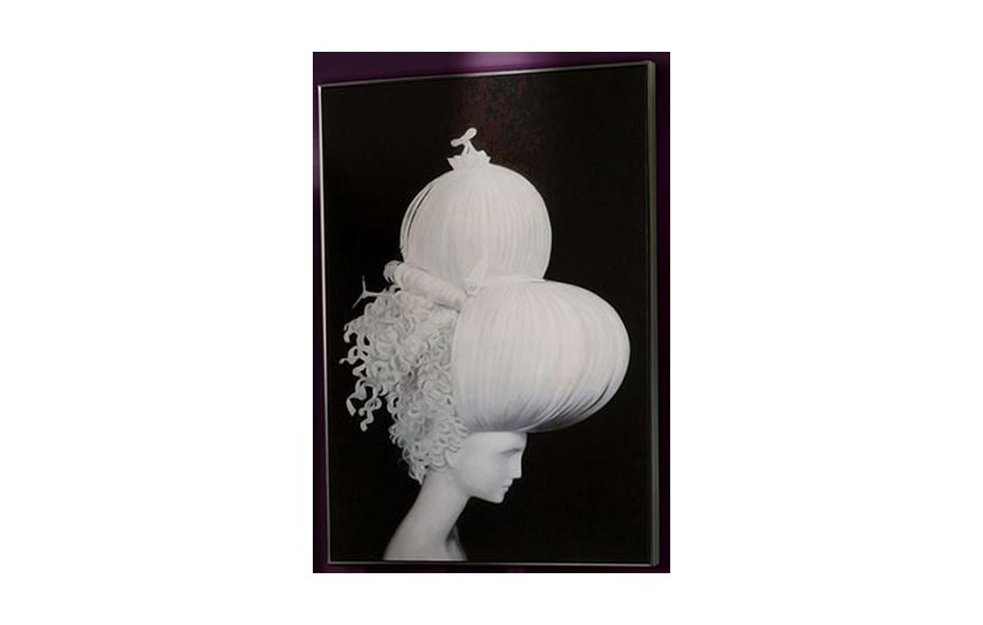 Pintura de perfil de mulher em tela com moldura prateada e fundo preto.